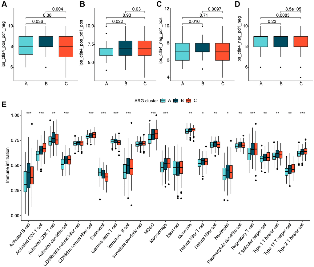 We further investigated the relationship between the different molecular subtypes of HCC and immune infiltration. Our results from the IPS analysis indicated that HCC samples from cluster B may respond better to immunotherapy with PD-1 and CTLA4 (Figure 3A–3D). Additionally, using the ssGSEA algorithm, we evaluated the immune infiltration landscape of the different HCC molecular subtypes. The findings from the immune infiltration assessment showed that most of the immune cell proportions were significantly higher in cluster B than in clusters A and C. These immune cell types included activated B cells, CD8+ T cells, immature B cells, neutrophils, type 1 T helper cells, and gamma delta T cells (Figure 3E). In summary, our results demonstrate a significantly different immune infiltration landscape between the various HCC molecular subtypes, which is closely associated with immunotherapeutic response.
