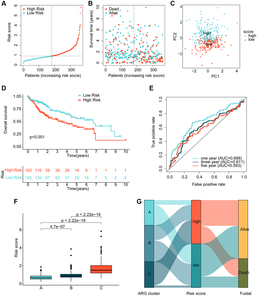 Using multivariate Cox analysis, we obtained risk coefficients and expression profiles of 3 independent prognostic factors, which we then used to calculate risk values for each HCC sample in the TCGA. HCC samples were subsequently divided into low- and high-risk subgroups based on their risk values. Scatter plots of the risk model indicated that HCC samples in the high-risk group contained more deaths (Figure 4A, 4B). Notably, unsupervised PCA analysis demonstrated two clear patterns of distribution of HCC risk subgroups (Figure 4C). Clinical survival outcome curves suggested that clinical prognostic outcomes were significantly better for HCC samples in the low-risk subgroup than in the high-risk subgroup (Figure 4D, p < 0.001). Time-related ROC curves suggested AUC of 0.688, 0.611, and 0.593 for 1-, 3-, and 5-years, respectively (Figure 4E). We also observed significantly higher risk scores for HCC samples in cluster C, which had the worst clinical prognosis, compared to clusters A and B (Figure 4F). Sankey plots demonstrating the association of HCC molecular subtypes and risk subgroups with clinical prognosis showed that HCC samples in cluster C were more likely to be classified into higher risk subgroups and were associated with poor clinical survival outcomes (Figure 4G).