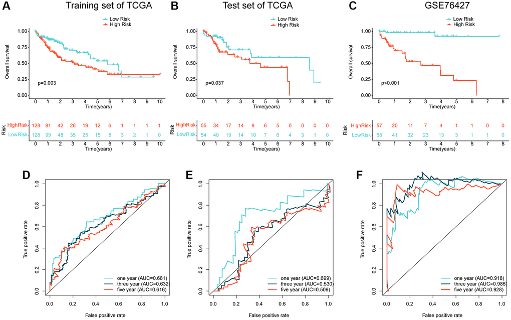 To validate the independence and reliability of the prognostic ARG-based risk model, we conducted both internal and external validation analyses using the TCGA dataset and GSE76427 dataset, respectively. Using the “caret” script, we randomly partitioned the HCC samples in TCGA into training and validation sets with a 7:3 ratio and calculated risk values for each sample in both sets. Our findings demonstrated that the clinical prognostic outcomes of the HCC samples in the low-risk subgroup were significantly better than those in the high-risk subgroup in both the training and validation sets, as shown in Figures 5A, 5B. Furthermore, in the external validation set, GSE76427, we observed consistent results where HCC samples in the high-risk subgroup exhibited worse clinical prognosis than those in the low-risk subgroup (Figure 5C). Time-dependent ROC curves showed AUC of 0.681, 0.632, and 0.616 for 1-, 3-, and 5-year predictions, respectively, in the training set, AUC of 0.699, 0.530, and 0.509 in the validation set, and AUC of 0.918, 0.986, and 0.928 in GSE76427 (Figure 5D–5F). Our results demonstrate that the ARG-based risk model can accurately and independently predict the clinical prognosis of HCC.
