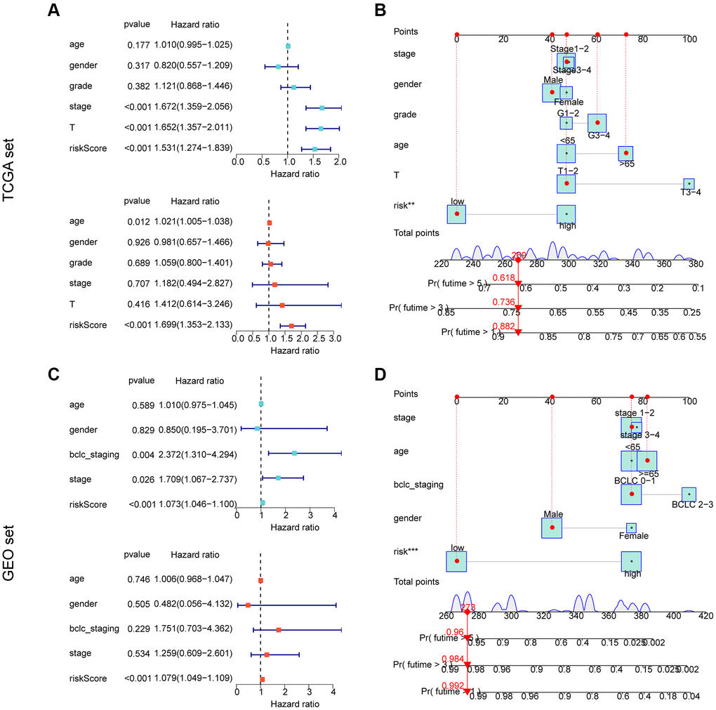 We conducted further analysis to assess the independent prognostic value of the risk model developed based on the prognostic ARGs in combination with other clinicopathological characteristics. Using the TCGA cohort, we performed univariate analysis and found that stage (HR = 1.672 (.359–2.056), T (HR = 1.652 (1.357–2.011), p < 0.001), and risk score (HR = 1.531 (1.274–1.839), p < 0.001) were significantly associated with poor prognosis of HCC. Multifactorial Cox analysis indicated that the risk score (HR = 1.699 (1.353–2.133)) was an independent prognostic factor for HCC (Figure 6A). We developed a nomogram based on the risk scores and clinicopathological characteristics of the TCGA cohort, which accurately predicted the 1-, 3-, and 5-year survival probabilities of HCC samples (Figure 6B) (Supplementary Figure 1A, 1B). For the GEO cohort, one-way Cox analysis showed that bclc-staging (HR = 2.372 (1.310–4.294), p = 0.004), stage (HR = 1.709 (1.067–2.737), p = 0.026), and risk score (HR = 1.073 (1.046–1.100), p < 0.001) were significantly associated with poor prognosis of HCC. Multivariate Cox analysis indicated that the risk score (HR = 1.079 (1.049–1.109), p < 0.001) was an independent prognostic factor for HCC (Figure 6C). We developed a nomogram based on the risk scores and clinicopathological characteristics of the GEO cohort, which accurately predicted the 1-, 3-, and 5-year survival probabilities of HCC samples (Figure 6D) (Supplementary Figure 1C, 1D). In conclusion, our results indicate that the ARG-based risk model is an independent prognostic factor for HCC samples, which is independent of clinicopathological features.
