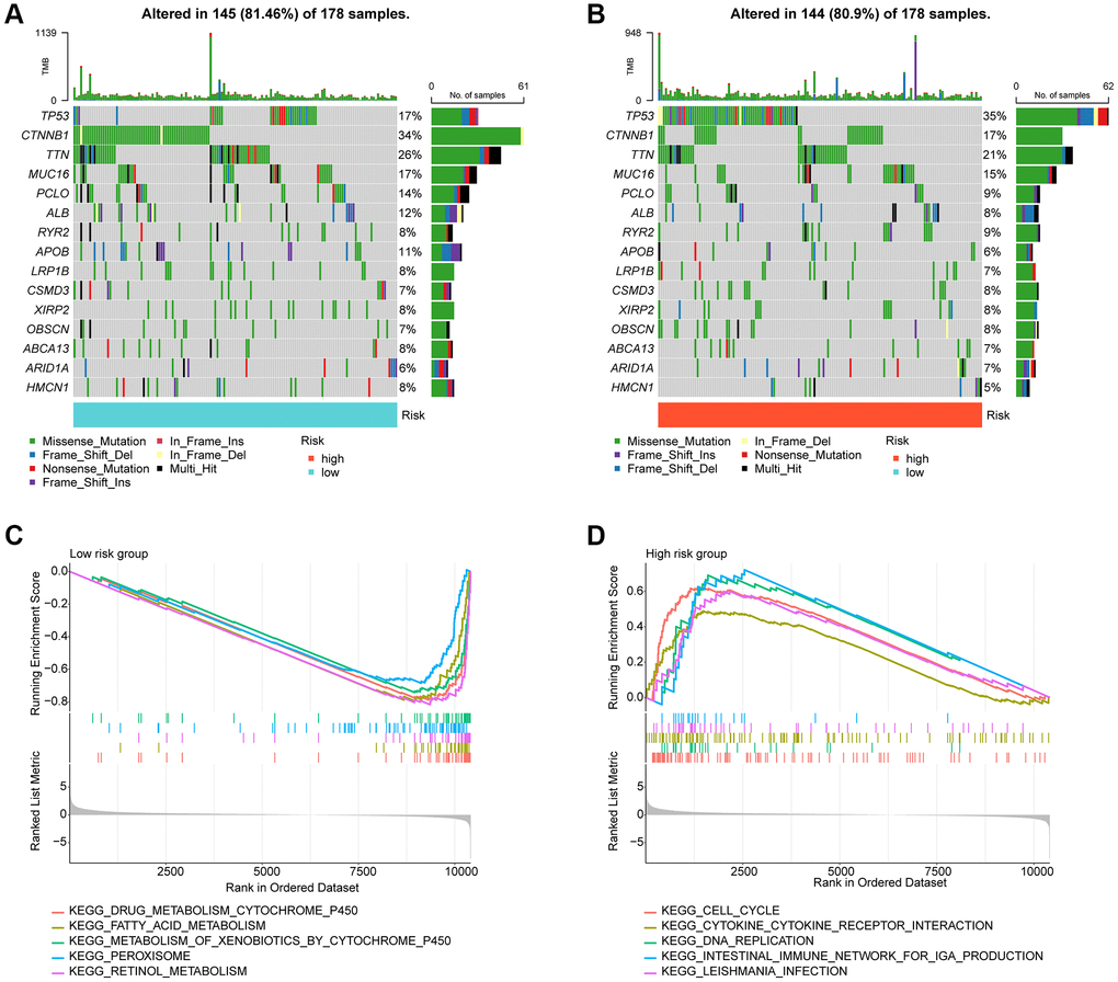 In the subsequent study, we delved deeper into the landscape of mutational load in HCC among the risk subgroups. Our findings showed that out of 178 samples in the low-risk subgroup, somatic mutations occurred in 145 (81.46%) samples, while in the high-risk subgroup, significant somatic mutations were present in 144 samples (80.9%). As depicted in Figure 7A, 7B, we observed that the frequency of mutations in TP53 was significantly higher in the high-risk subgroup compared to the low-risk subgroup. Conversely, the frequency of mutations in ALB, PCLO, MUC16, TTN, and CTNNB1 was significantly lower in the high-risk subgroup compared to the low-risk subgroup. To gain a better understanding of the potential regulatory mechanisms in different risk subgroups, we analyzed the KEGG pathway in the high- and low-risk subgroups based on GSEA. Our results suggested a significant enrichment of metabolism-related signaling pathways in the low-risk subgroup, which included drug metabolism cytochrome p450 and fatty acid metabolism. In contrast, the high-risk subgroup showed a significant enrichment of tumor and immune-related signaling pathways such as cell cycle, DNA Replication, and cytokine-cytokine receptor interaction (Figure 7C, 7D).