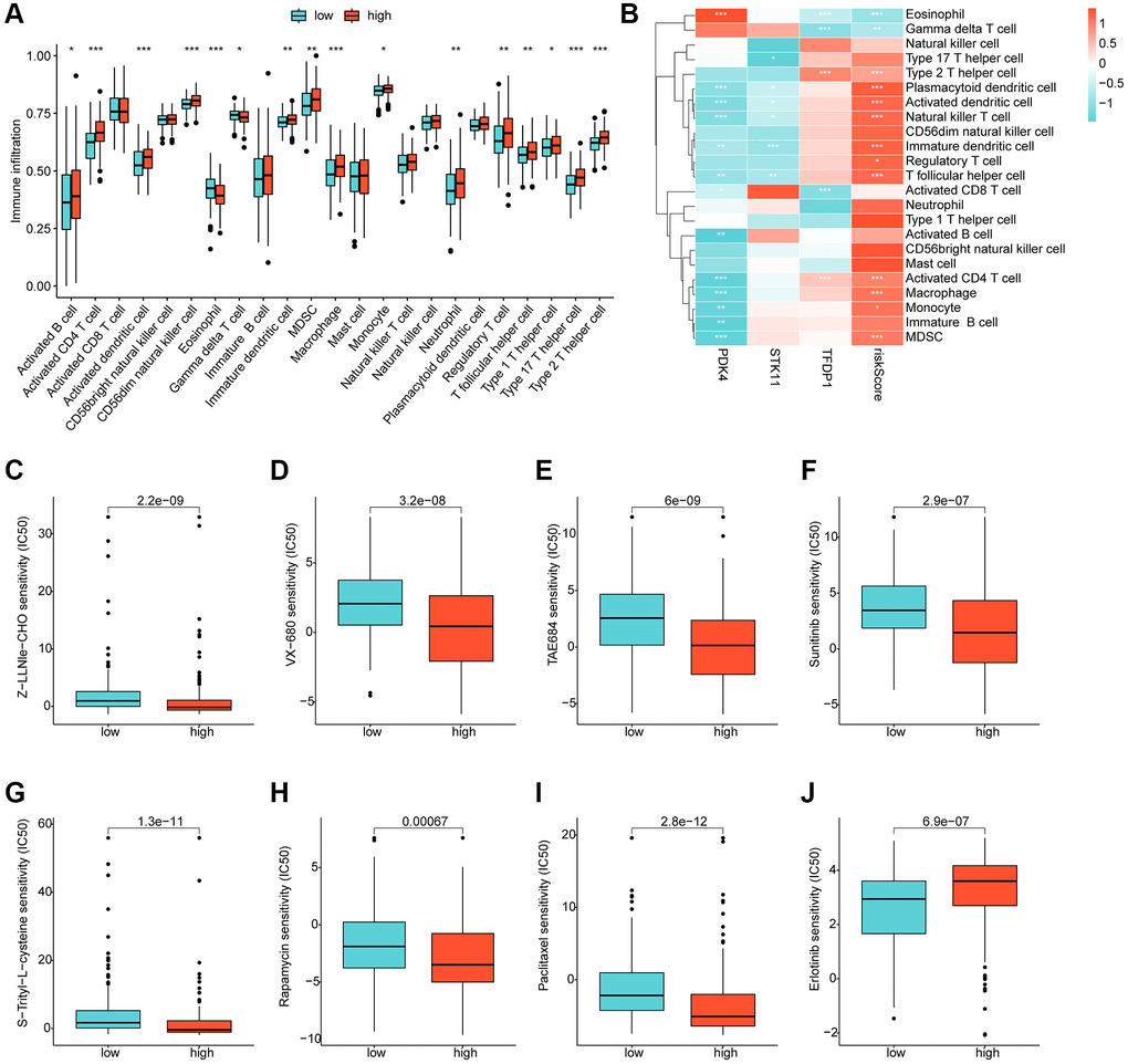 Using ssGSEA, we conducted a further analysis of the immune infiltration characteristics of HCC in the risk subgroups. Our findings indicated a significantly higher proportion of most immune cells in the high-risk subgroups compared to the low-risk subgroups, signifying a greater immune infiltration status of HCC in the former group (Figure 8A). Correlation analysis showed a significant positive correlation between the risk score and most immune cells, including MDSC, CD4+ T cells, macrophage, monocyte, and immature dendritic cells, while a significant negative correlation was observed with eosinophil and gamma delta T cells. We also observed significant correlations of PDK4, STK11, and TFDP1 with the majority of immunity (Figure 8B). Furthermore, we utilized the GDSC database to predict potential chemotherapeutic agents for HCC samples. Our results demonstrated significantly lower IC50 values for Z-LLNle-CHO, VX-680, TAE684, Sunitinib, S-Trityl-L-cysteine, Rapamycin, and Paclitaxel in the high-risk group compared to the low-risk group, whereas the IC50 for Erlotinib was significantly higher in the high-risk group (Figure 8C–8J).