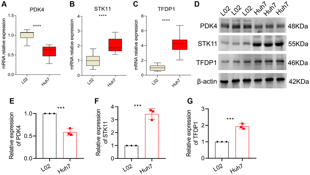 In order to validate our findings, we conducted further in vitro experiments to assess the mRNA and protein expression levels of PDK4, STK11 and TFDP1. Our results showed that compared to the normal cell line L02, the expression of PDK4 was significantly lower, while the expression of STK11 and TFDP1 was significantly higher in the HCC cell line Huh7 (Figure 9A–9C). Western blot analysis also confirmed our findings, as the protein levels of PDK4 were significantly higher in the L02 cell line, while STK11 and TFDP1 were significantly higher in the Huh7 cell line (Figure 9D–9G).