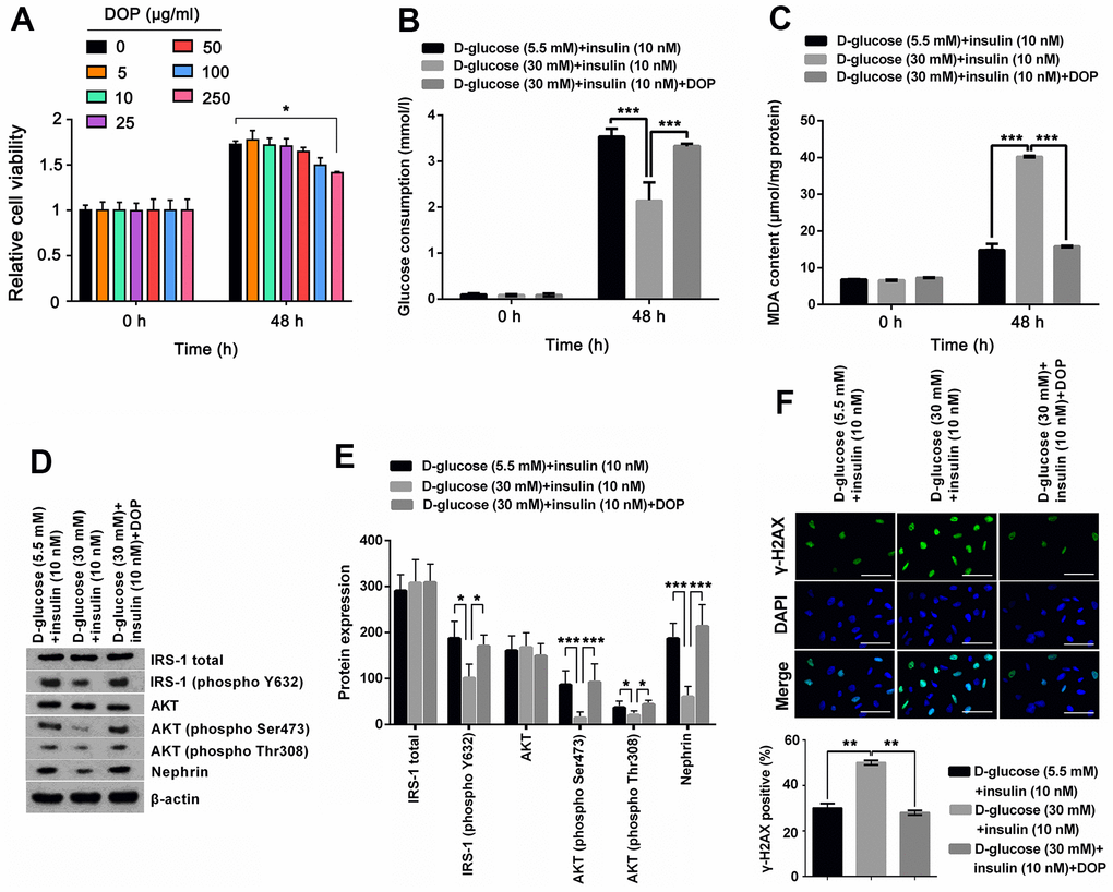 To determine the safety dosage of DOP, MPC5 cells were treated with various dosages of DOP (0, 5, 10, 25, 50, 100 and 250 μg/ml) for 48 hours. Cell viability analysis showed that DOP at concentrations from 0 to 100 μg/ml had no significant effect on the cell viability (Figure 2A). DOP only at high concentration, 250 μg/ml, suppressed the cell viability (p < 0.05). For the safety, a DOP concentration of 50μg/ml was chosen the formal study. For evaluation of the effect of DOP in HG-induced MPC5 cells, cells were cultured with 30mM of D-glucose and DOP for 48 h, and then were stimulated with insulin. Afterwards, glucose consumption, productions of MDA, as well as the phosphorylation of IRS-1 and AKT were respectively determined. Results shown in Figure 2A and 2B demonstrated that DOP treatment distinctly relived HG-induced reduction of glucose consumption (p < 0.001, Figure 2B) and increase of MDA production (p < 0.001, Figure 2C), while no notable difference was observed at the initial time. Besides, DOP treatment notably reversed HG-triggered suppressing effects on the expression of IRS-1 (phospho Y632), AKT (phospho Ser473), AKT (phospho Thr308) and Nephrin (p <0.05 or p <0.001, Figure 2D, 2E). Moreover, detection of γ-H2A.X foci formation, an indicator of DNA double strand breaks (DSBs), revealed that HG treatment distinctly augmented the percentage of cells bearing γ-H2A.X foci (p <0.01, Figure 2F), while this effect was notably reversed by DOP treatment (p <0.01, Figure 2F). These outcomes manifested that DOP treatment distinctly relieved HG-induced oxidative stress and IR, as well as DNA damage in MPC5 cells.