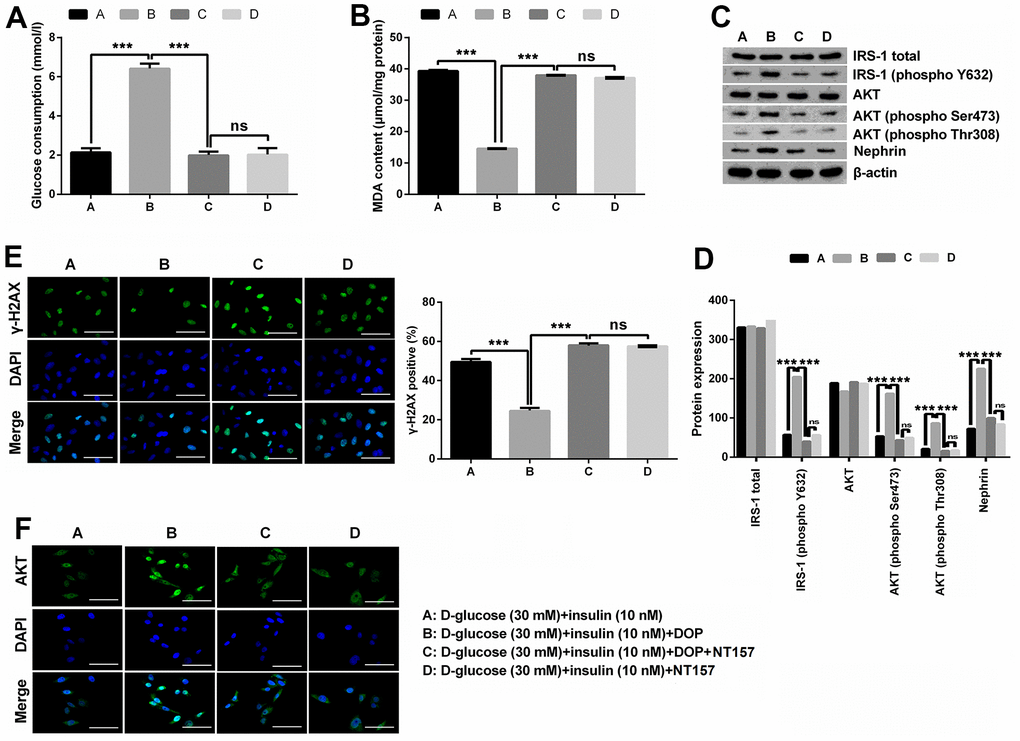 NT157 is a selective inhibitor of IRS-1/2. NT157 exposure was reported to elicit time- and dose-dependent reduction in IRS-1 levels, and suppress the activation of IGF1R, as well as IGF1-induced activation of AKT. In this study, for exploration of the potential mechanisms of how DOP treatment relieved HG-induced effects, MPC5 cells were precultured with IRS-1/2 inhibitor NT157. NT157 treatment remarkably reversed DOP treatment-induced protective effects on MPC5 cells, exhibiting as markedly decreased glucose consumption (p < 0.001, Figure 3A), while notably augmented MDA productions in MPC5 cells (p < 0.001, Figure 3B). Besides, NT157 treatment also remarkably reversed DOP-induced increased phosphorylation of IRS-1 (phospho Y632), AKT (phospho Ser473), AKT (phospho Thr308) and Nephrin (all p < 0.01, Figure 3C, 3D). As for the formation of γ-H2A.X foci, the results displayed in Figure 3E demonstrated that NT157 treatment distinctly augmented the number of γ-H2A.X positive cells compared with DOP treated group (p < 0.001), which indicates that DNA damage still exists after treated with IRS-1/2 inhibitor NT157. Previous investigations revealed that the unphosphorylated AKT is mainly located in the cytoplasm, while AKT phosphorylation induces the translocation to the nuclear, thereby activating the downstream pathways. Moreover, DOP treatment remarkably increased the nuclear translocation of AKT, while this effect was notably counteracted by IRS-1/2 inhibitor NT157 treatment (Figure 3F), which indicating that DOP treatment promoted the activation of AKT, while IRS-1/2 inhibitor NT157 repressed the activation of AKT. Besides, there was no significant difference observed between the DOP plus NT157 and NT157 group (Figure 3A–3F). Combination of these outcomes demonstrated that DOP treatment relieved HG-triggered injury through enhancing the phosphorylation of IRS1/AKT.