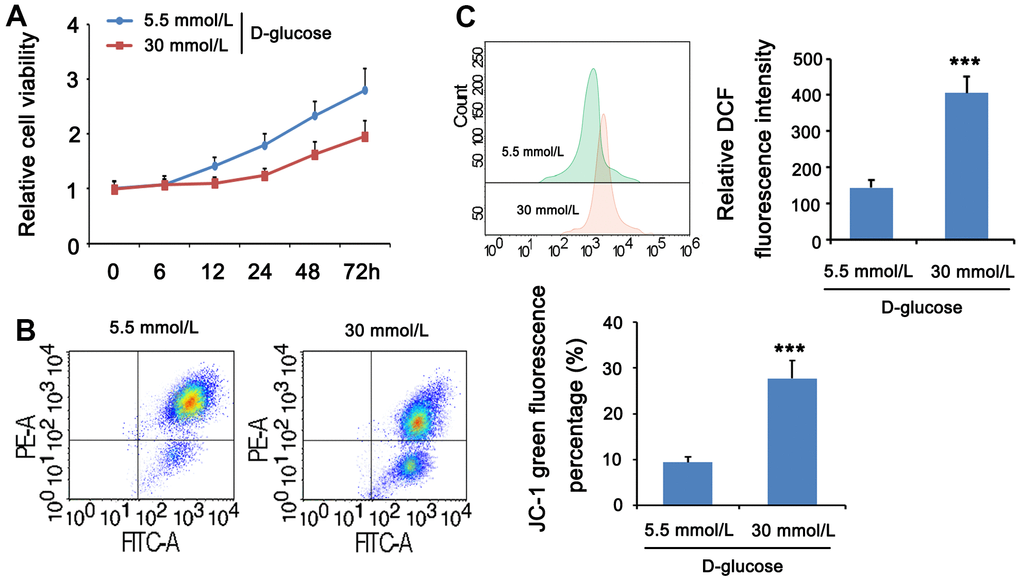 HG can cause cell and mitochondrial damage. To investigate the mitochondrial activity of MPC5 cells stimulated with HG, we measured cell viability, MMP, and ROS levels in both normal and HG groups. The CCK-8 assay revealed that the normal glucose group’s cell viability improved with time, whereas the high glucose group’s cell viability decreased and was lower than the comparable time point of the normal glucose group from 12 h. (Figure 4A). JC-1 labeling was used to assess the effect of HG on mitochondria in MPC5 cells by measuring MMP. The intensity ratio of JC-1 aggregates to JC-1 monomers or the percentage of JC-1 green fluorescence, which shows the change of MMP, was considerably lower in the HG group than in the normal glucose group (p <001, Figure 4B). ROS production was then evaluated by flow cytometry with DCFH-DA labeling to determine the ROS levels in MPC5 cells following stimulation with HG. Figure 4C. reveals that the relative DCF fluorescence intensity was considerably greater in the HG group than in the control group, showing that HG stimulation generated an excess of ROS generation (p <0.001, Figure 4C). These findings imply that a HG concentration may result in mitochondrial malfunction, increased ROS, and lower cell viability.