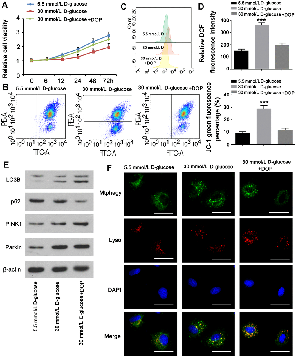 Experiments were done to determine whether DOP may stimulate mitophagy in MPC5 cells in vitro. The CCK-8 assay revealed that the viability of cells in group A was normal, whereas the viability of cells in group B was diminished. Compared to group B, the cell viability of group C was greatly restored. HG generated a pronounced decline in cell viability, which was reversed by DOP administration (Figure 5A). Treatment with DOP can attenuate mitochondrial dysfunction generated by HG levels (p <0.001, Figure 5B). Flow cytometry revealed that the ROS level in the HG group was substantially higher than in the control group. In contrast, ROS levels were considerably lower in the DOP-treated group versus the HG group (p<0.001, Figure 5C). Mitophagy has a protective effect on cells. Using western blotting, the expression of mitochondrial mitophagy-related proteins was identified. After DOP stimulation, PINK1, Parkin, and LC3B were up-regulated, while the autophagy receptor P62 was down-regulated (Figure 5E). HG stimulation and DOP increased the fluorescence intensity of mitophagy and lysosomes in comparison to normal glucose (Figure 5F).