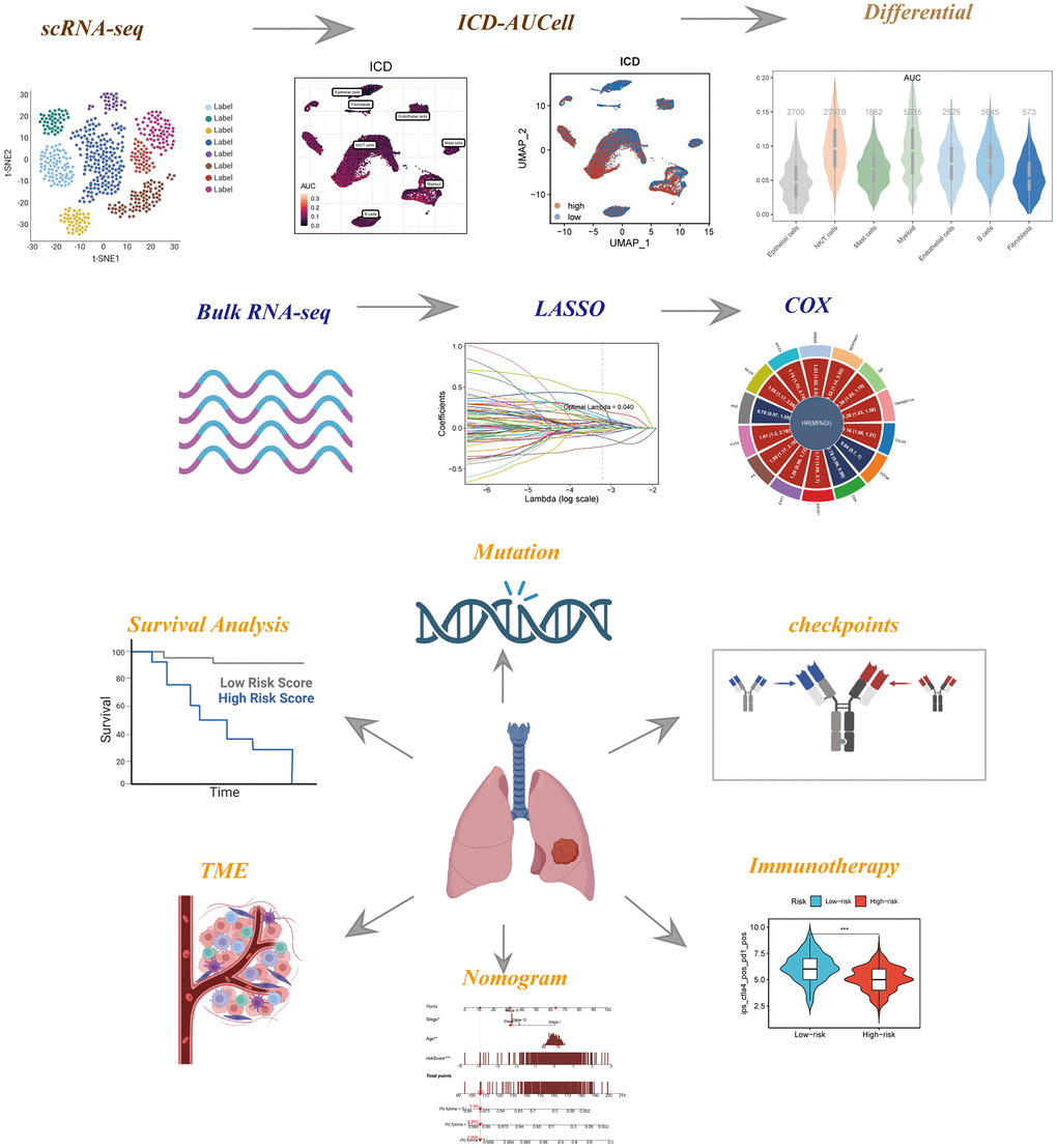 This drives the necessity to investigate signatures associated with ICD in LUAD. Unraveling these signatures holds the promise of prognostic insights and informs the potential for immunotherapeutic interventions. The identification of such signatures enables the prediction of patient prognosis and facilitates the identification of individuals who might benefit from immune-based therapies. Consequently, exploring the interplay between ICD, prognosis, and immunotherapy stands to revolutionize our approach to managing LUAD and improving patient outcomes.