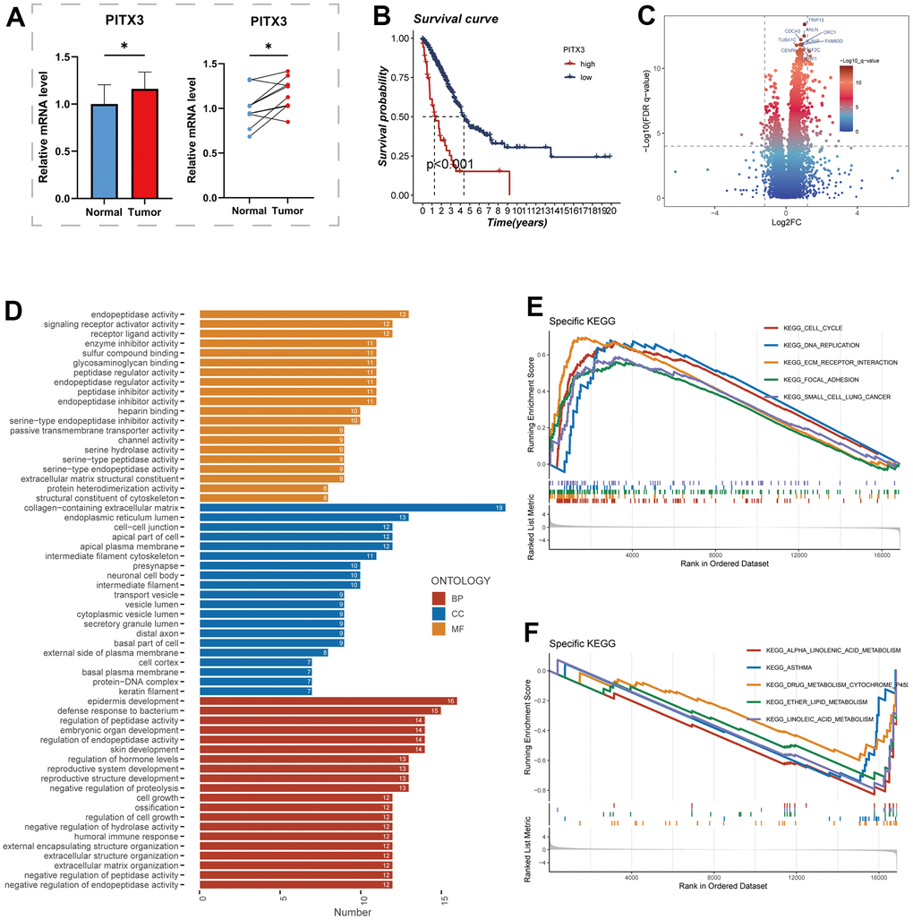 For further analysis, the PITX3 gene, which exhibited the highest HR value, was selected from the model gene. Figure 10A illustrates the elevated expression levels of PITX3 in tumor samples. Additionally, the high expression of the PITX3 gene was associated with a poorer prognosis compared to the low expression group (P<0.001, Figure 10B). These conspicuous differences align with our bioinformatic findings, suggesting that PITX3 could serve as a promising biomarker for early detection of LUAD. Subsequently, LUAD patients were divided into high and low expression groups based on PITX3 expression, and differential analysis was performed. Figure 10C showcases the differentially expressed genes, highlighting the top 10 genes with the most significant differences. Furthermore, GO and GSEA enrichment analyses of these differentially expressed genes revealed significant enrichment in pathways related to collagen-containing extracellular matrix and cell-cell junctions in the highly expressed PITX3 group (Figure 10D, 10E).