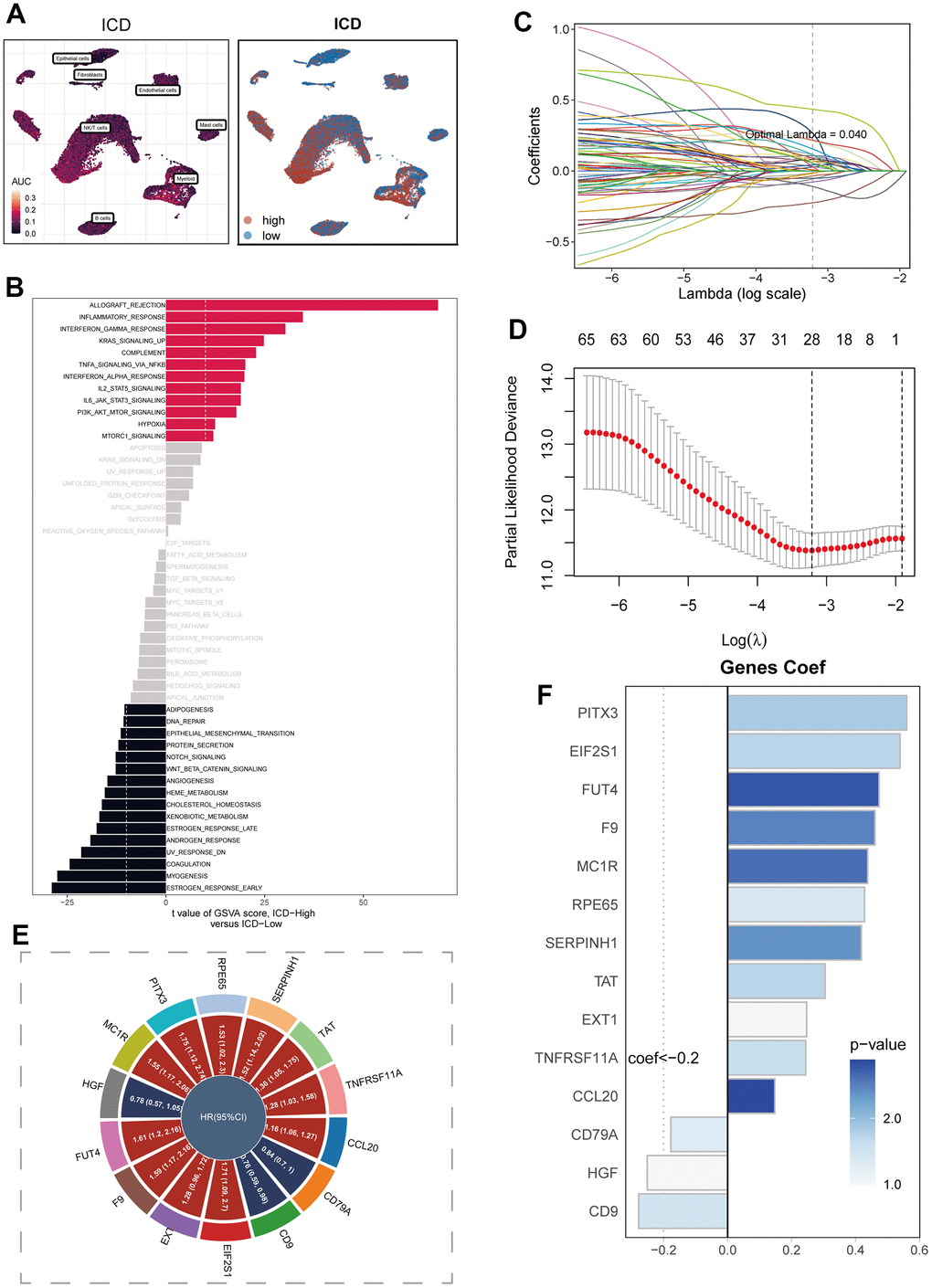 In Figure 3A, the visualization of ICD activity in cells was presented using the AUCell algorithm. In order to offer a more visual portrayal of the ICD scores in cells, the cells were dichotomized based on the median value of these scores. Through the execution of GSVA enrichment analysis, the observation emerged that cells categorized within the high ICD group manifested noteworthy enrichment in pathways related to Allograft Rejection, Inflammatory Response, and Interferon Gamma Response (Figure 3B). In contrast, the Estrogen Response Early pathway demonstrated marked enrichment in the low ICD group. Moving forward, the marker genes that exhibited differential expression in the high and low ICD groups, as acquired from Bulk RNA-seq data, were harnessed to formulate prognostic models via COX and Lasso regression analyses. The process of identifying pivotal prognostic variables was depicted in Figure 3C, 3D. The subsequent Figure 3E depicted the hazard ratio (HR) values corresponding to each variable integrated into the model, while Figure 3F showcased the coefficients attributed to specific variables within the model.