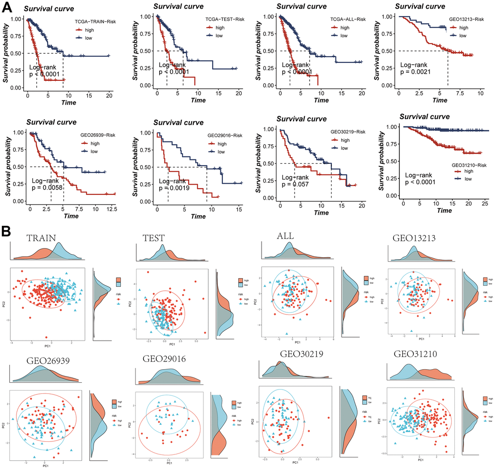 The computation of individual patient risk scores entailed the multiplication of model gene expression values by their respective coefficients. Subsequent to this, patient stratification into high and low-risk categories was conducted based on the median risk score value. It is noteworthy that both the TCGA dataset and the five GEO cohorts consistently exhibited inferior prognosis outcomes within the high-risk group, thereby substantiating the precision and robustness of the developed model (Figure 4A). The distribution of samples was visually presented through a PCA plot, elucidated in Figure 4B. Furthermore, the spatial arrangement of samples within the high- and low-risk groups was depicted in the t-SNE plot, accessible in Supplementary Figure 2.