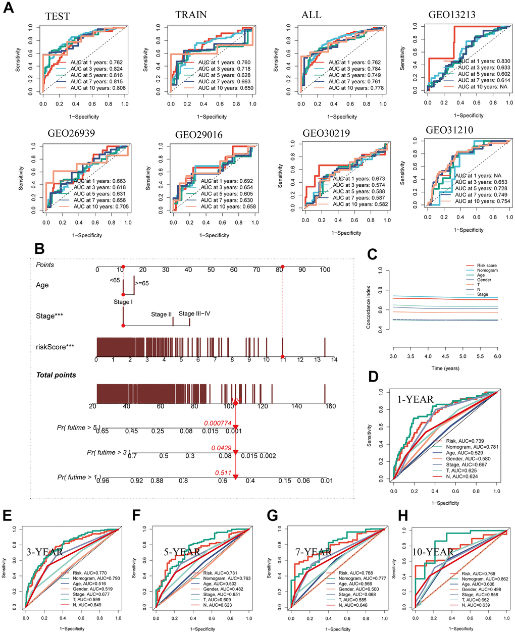 The predictive performance of the model regarding prognosis was meticulously evaluated through the utilization of ROC curves across both the TCGA dataset and the five GEO datasets, thereby substantiating the robustness and consistency of our developed model within the ambit of multi-dataset validation. Remarkably, a substantial majority of the AUC values surpassed the threshold of 0.6 across both the TCGA and GEO datasets, as evidenced in Figure 5A. To comprehensively assess the risk associated with TCGA-LUAD patients, a nomogram was meticulously formulated, integrating crucial clinical features alongside risk group stratification. As depicted in Figure 5B, this nomogram visually encapsulates patient stage, age, and risk score, thereby serving as a valuable tool for enhanced precision in risk assessment and informing forthcoming treatment strategies. Inclusive of C-index curves, the analysis demonstrated the superior predictive performance of the nomogram scores when compared against alternative clinical features and risk scores, as illustrated in Figure 5C. Moreover, the nomogram’s accuracy was methodically gauged via prognostic ROC analysis, consistently showcasing markedly superior performance in comparison to other clinical features and risk scores. Notably, the AUC values for various time horizons including 1, 3, 5, 7, and 10 years were 0.781, 0.790, 0.763, 0.777, and 0.862, respectively, underscoring the substantial predictive capability of the nomogram across diverse temporal scopes (Figure 5D–5H).