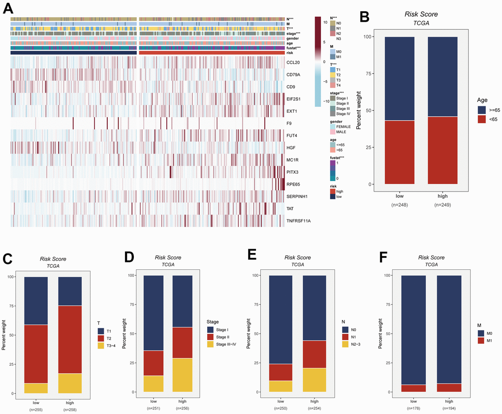 To visually depict the distribution of clinical attributes within distinct risk subgroups, a heatmap was meticulously generated. This heatmap seamlessly amalgamates pertinent clinical information with the high- and low-risk subgroups, as vividly depicted in Figure 6A. Notably, the high-risk cohort exhibited a discernible association with more advanced T-stage, N-stage, and clinical stage statuses. These findings, showcased in Figure 6B–6F, collectively signify an unfavorable prognostic outlook for patients encompassed within the high-risk subgroup.