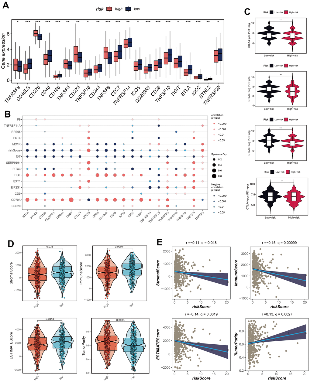 An all-encompassing scrutiny of the immune cell infiltration within TME can serve as a conduit for comprehending the intricate mechanisms underpinning cancer's evasive maneuvers against immune responses, thereby opening avenues for the formulation of innovative therapeutic strategies [54]. The meticulous investigation of immune cell infiltration disparities between the high-risk and low-risk cohorts unveiled a conspicuous augmentation of immune cell abundance within the low-risk group in contrast to their high-risk counterparts. It is noteworthy that prior investigations have underscored the interrelation between immune checkpoint gene expression levels and the efficacy of immunotherapeutic interventions [55]. Delving into the variations of immune checkpoint genes between the high-risk and low-risk groups proposed the potential for the low-risk group to glean added therapeutic advantage from targeting supplementary immune checkpoints. Within the realm of cancer treatment, therapeutic modalities geared towards the TME have risen to prominence, recognized for their promise in leveraging the pivotal role that the TME holds in steering tumor progression and influencing responses to standard therapeutic regimens [56–59]. Notably, assessment of TME scoring unveiled a notable elevation in immune scores within the TME of the low-risk cohort, distinct from their high-risk counterparts, with a statistically significant divergence. This compelling observation lends credence to the notion that patients harboring low-risk profiles might exhibit heightened responsiveness to immunotherapy. Adding to these insights, a systematic analysis appraising the comparative immunotherapy advantages between the high-risk and low-risk groups corroborated the prospective amplified therapeutic gains for individuals encompassed within the low-risk classification.