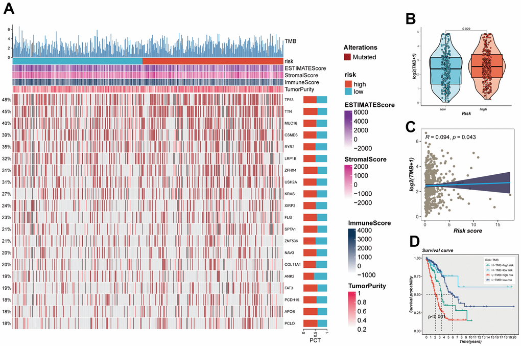 The impact of somatic mutations on the outcomes of cancer immunotherapy is inherently variable. The mutational landscape inherent to TCGA-LUAD was subject to meticulous examination, with the outcomes comprehensively illustrated in Figure 9A. Furthermore, an intricate and systematic juxtaposition was orchestrated to meticulously unravel the variances in TMB that might distinguish the high and low-risk groups. Evidently, this analytical endeavor unveiled a discernible augmentation in the frequency of mutations within the high-risk contingent of LUAD (Figure 9B). This assertion was corroborated through an intensive Spearman correlation analysis, which underscored a statistically significant and positive correlation between risk scores and TMB (R = 0.094, P = 0.043, Figure 9C). Utilizing a pragmatic approach predicated on the median benchmarks of TMB and risk scores, a judicious stratification of LUAD patients occurred, subsequently yielding four distinct categories: high-mutation+high-risk, high-mutation+low-risk, low-mutation+high-risk, and low-mutation+low-risk. The ensuing elucidation of outcomes distinctly delineated that individuals contending with high-mutation+low-risk LUAD exhibited a notably promising prognostic trajectory, in stark contrast to their counterparts grappling with low-mutation+high-risk LUAD, who faced a markedly less favorable prognostic landscape (Figure 9D).