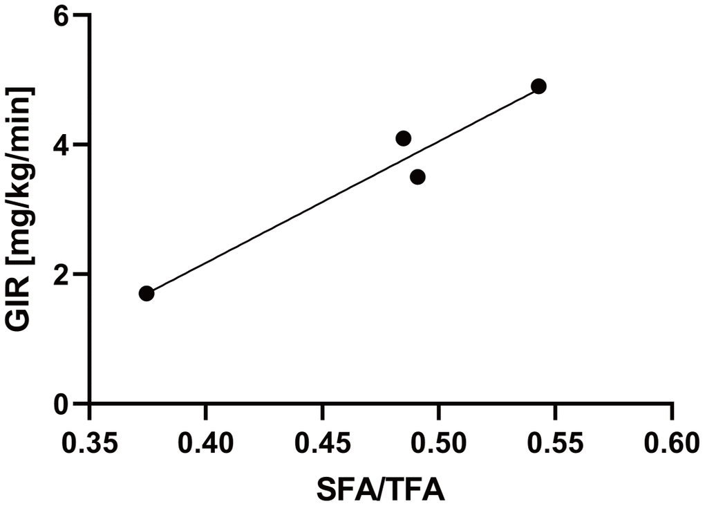 In this study, the hyperinsulinemic-euglycemic clamp technique was used to assess insulin resistance in four patients with WS attending our hospital. The characteristics of the four patients are listed in Table 1. Two of the four patients were female, and the median age of the patients was 46 years old (Table 1). The median values of the body mass index (BMI) and skeletal muscle mass index (SMI) were 19.5 and 4.7, respectively, indicating sarcopenia with a relatively small body weight (Table 1). Moreover, we assessed visceral and subcutaneous fat areas using abdominal computed tomography (CT), which showed visceral fat area (VFA) accumulation and a low percentage of the subcutaneous fat area (SFA) (Table 1). The median value of glucose infusion rate (GIR) was 3.8 mg/kg/min, indicating insulin resistance (normal range > 6.0 mg/kg/min; Table 1). Additionally, to investigate the association between lipodystrophy and insulin resistance, we compared subcutaneous fat area/total fat area (SFA/TFA) to the GIR and found a significant positive correlation (R2 = 0.95, p = 0.024; Figure 1). These results suggest that subcutaneous fat loss in patients with WS may be associated with aggravated insulin resistance.