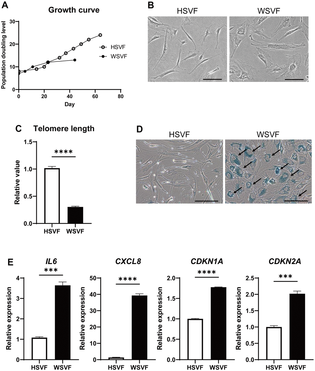 Next, we assessed adipose-derived stem cells from the stromal vascular fraction (SVF) obtained from subcutaneous adipose tissues of a patient with WS in vitro. The SVF derived from the subcutaneous fat of a 64-year-old healthy individual (HSVF) was compared to that of a 47-year-old patient with WS (WSVF), and both individuals were women. Analysis of the cell growth curve showed that WSVF exhibited premature cell proliferation arrest (Figure 2A). WSVF cells also exhibited senescence-like morphology with enlarged and flattened cell shape at an early passage (population doubling level: PDL 10; Figure 2B). Additionally, quantitative polymerase chain reaction (qPCR) analysis revealed that the telomere length was significantly shortened in WSVF (p < 0.0001; Figure 2C). The number of senescence-associated β-galactosidase (SA-β-gal) positive cells was increased in WSVF compared to HSVF (indicated by black arrows, Figure 2D). Furthermore, WSVF showed increased expression levels of senescence-associated inflammatory cytokines, SASP genes, such as IL6 (p < 0.001) and CXCL8 (p < 0.0001). The expression of CDKN1A (p < 0.0001) and CDKN2A (p < 0.001), major cyclin-dependent kinase inhibitors, also increased in WSVF compared to HSVF (Figure 2E). These results indicate that the SVF of patients with WS exhibits premature cellular senescence with increased expression levels of SASP genes.