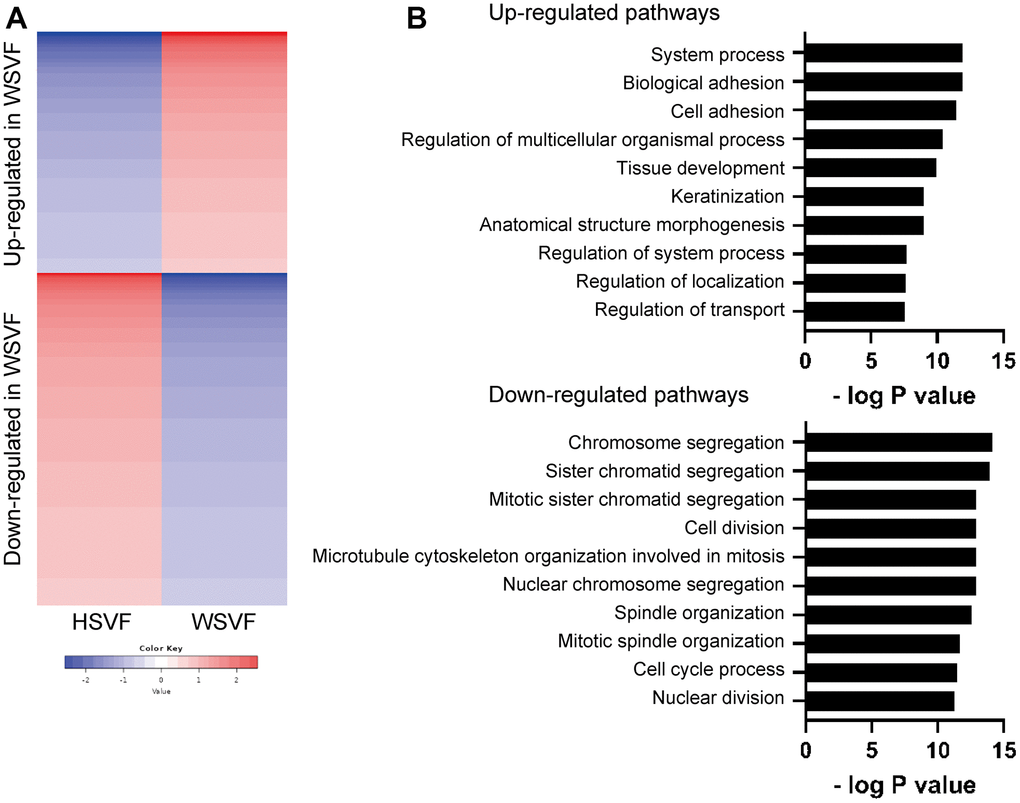 To investigate the gene expression and pathways involved in cellular senescence in WSVF, we performed a transcriptome analysis of WSVF and HSVF. We analyzed the data using k-means clustering and conducted a pathway analysis using gene ontology (GO) biological processes. The top 2000 genes with the largest changes in expression were analyzed; 821 genes were upregulated and 1179 genes were downregulated in WSVF compared to HSVF (Figure 3A, 3B). Pathway analysis using GO biological processes revealed that genes related to cell adhesion and cell structure were upregulated in WSVF whereas those related to chromosome organization and segregation, nuclear division, and cell cycle were downregulated (Figure 3B). These results were consistent with premature cellular senescence.