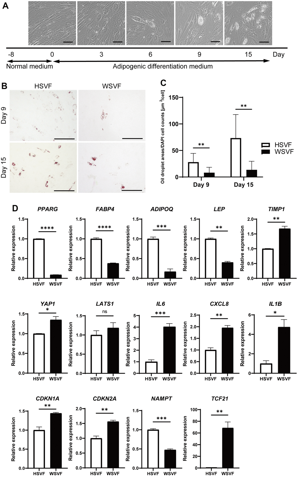 We subsequently performed adipogenesis experiments to evaluate the adipogenic potential of WSVF. The protocol for adipogenic differentiation is shown in Figure 4A. During adipogenesis, the number of cells with lipid droplets increased in HSVF (Figure 4A). Oil Red O staining showed that the stained areas were reduced in WSVF on both days 9 and 15 (Figure 4B). Moreover, quantification of the Oil Red O-stained area showed that the number of cells positive for Oil Red O staining was significantly decreased in WSVF compared to that in HSVF on both days 9 and 15, indicating suppressed adipogenesis in WSVF (p < 0.01; Figure 4C). During adipogenesis, WSVF exhibited decreased expression levels of PPARG (p < 0.0001) and FABP4 (p < 0.0001), adipogenesis-related genes, and ADIPOQ (p < 0.001) and LEP (p < 0.01) compared to HSVF (Figure 4D). In contrast, WSVF exhibited increased expression levels of TIMP1 (p < 0.01) and YAP1 (p < 0.05), which are suppressors of adipogenesis [13, 14] but decreased expression levels of NAMPT (p < 0.001), which is a gene related to mitochondrial function, compared to HSVF (Figure 4D). Furthermore, during adipogenesis, the expression levels of the inflammatory molecules SASP, such as IL6 (p < 0.001), CXCL8 (p < 0.01), and IL1B (p < 0.05), and those of senescence-related cell cycle regulators, such as CDKN1A (p < 0.01) and CDKN2A (p < 0.01), were increased in WSVF compared to HSVF (Figure 4D). Interestingly, TCF21, whose expression is usually increased in visceral fat [15, 16], was also increased (p < 0.01) in WSVF compared to HSVF (Figure 4D). These results suggest that adipogenesis is suppressed and inflammatory genes are increased in WS.