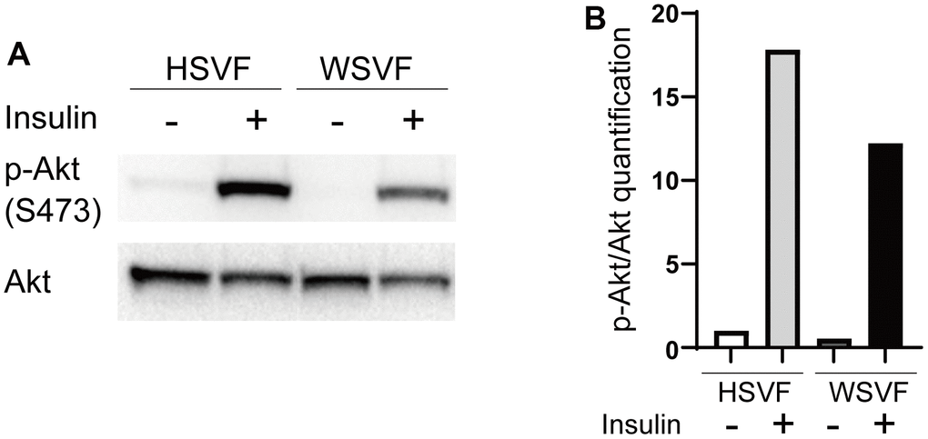 We investigated insulin-related pathways in WSVF using western blotting. After stimulation with insulin, the protein expression levels of p-Akt compared to Akt in WSVF were lower than those in HSVF (Figure 5A). The p-Akt/Akt ratio was reduced to 68.6% in WSVF compared to that in HSVF (Figure 5B). IRS1 and PI3K were decreased in WSVF (Supplementary Figure 3). Moreover, similar results were obtained for WS fibroblasts where the p-Akt/Akt ratio was reduced in WS fibroblasts compared to that in normal fibroblasts (Supplementary Figures 1, 2). These in vitro results suggest aggravated insulin resistance in WS.