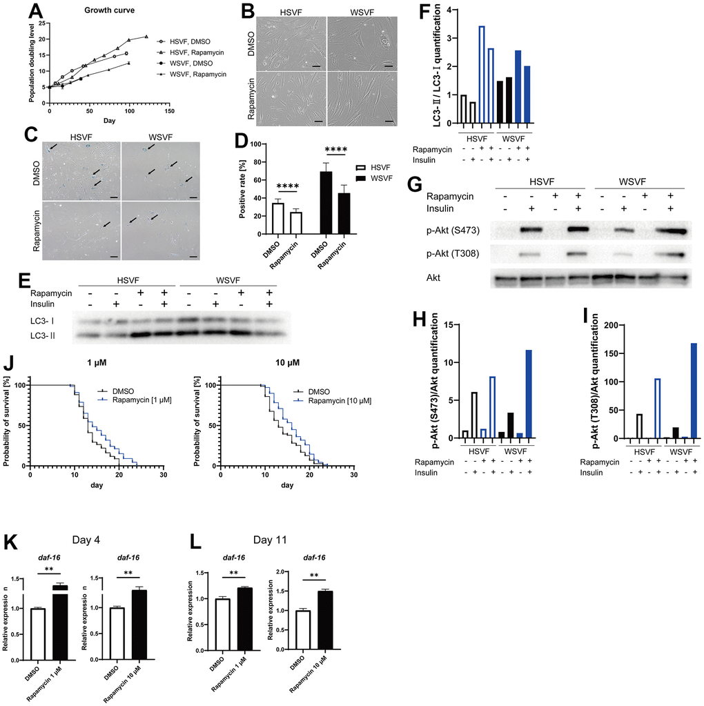 To investigate the effect of rapamycin on autophagy, we investigated LC3 using western blotting and found that LC3-II/LC3-I [18] expression levels were increased in WSVF (Figure 6E, 6F), suggesting that autophagosome excessively accumulates in WSVF. Treatment with rapamycin further increased LC3-II/I ratio in WSVF. The mTOR and S6K phosphorylation were decreased with the addition of rapamycin in SVF, confirming the general effect of rapamycin (Supplementary Figure 3). Rapamycin also restored the p-Akt (S473)/Akt ratio from 55.1% to 191.2% and p-Akt (T308)/Akt ratio from 45.0% to 387.2% in WSVF compared to HSVF under stimulation with insulin (Figure 6G–6I). Moreover, similar results were obtained for WS fibroblasts (Supplementary Figure 2). Furthermore, in vivo, 1 μM (p < 0.01) and 10 μM (p < 0.05) of rapamycin significantly prolonged the life span of WRN-knockout C. elegans (gk99) (Figure 6J). Moreover, the expression of daf-16, a gene repressed by mammalian target of rapamycin complex 1 (mTORC1), increased in gk99 treated with 1 μM and 10 μM of rapamycin on days 4 and 11 (p < 0.01) (Figure 6K, 6L). These results suggest that rapamycin rescues cellular senescence and insulin resistance in WSVF, and extends the lifespan of the WS model in vivo.