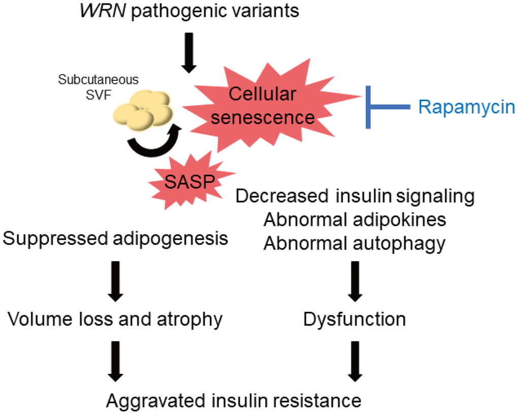 The present study revealed for the first time, that a decrease in subcutaneous fat mass to total fat mass ratio was associated with aggravated insulin resistance in patients with WS. We revealed that SVF derived from subcutaneous fat tissues of patients with WS exhibited premature cellular senescence, accompanied by elevated SASP and suppression of adipogenic differentiation in vitro. Furthermore, we demonstrated that rapamycin rescues cellular senescence in WSVF and extended the life span of WRN-knockout C. elegans (gk99) in vivo.