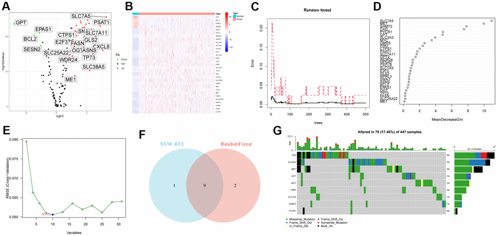 First, we analyzed the differential expression of 118 glutamine metabolism family genes in the TCGA-CRC cohort, and the results showed that 31 GMRGs were differentially expressed genes (DEG), of which 4 GMRGs were down-regulated and 27 GMRGs were up-regulated. Figure 1A shows the volcano map of GMRG as well as the heat map of DEG (Figure 1B). Then, we performed two machine learning algorithms on DEG to screen out characteristic gene: RandomForest (Figure 1C, 1D) and SVM-RFE (Figure 1E). Detailed results are detailed in Supplementary Table 1. According to the results of the above two machine learning algorithms, we used the Venn diagram to obtain 9 overlapping genes and defined them as characteristic gene (Figure 1F). Finally, we explored the mutation status of CRC signature genes and found that CAD (6%), SLC3A2 (5%) and MET (4%) had the highest mutation rates (Figure 1G).