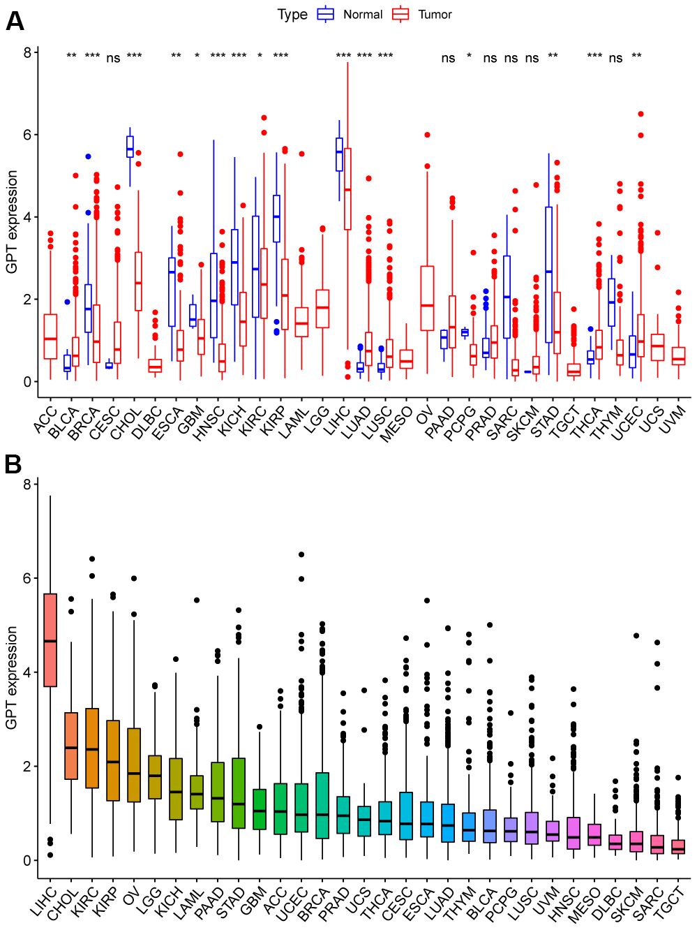 GPT was differentially expressed in 16 cancers compared to normal tissues. Specifically, GPT was low expressed in BRCA, CHOL, ESCA, GBM, HNSC, KICH, KIRC, KIRP, LIHC, LUAD, LUSC, PCPG, STAD, UCS, and highly expressed in BLCA, LUAD, LUSC, THCA (Figure 10A). Furthermore, we sorted the expression of the tumor tissues, we found that GPT had the lowest expression level in TGCT and the highest expression level in LIHC (Figure 10B).