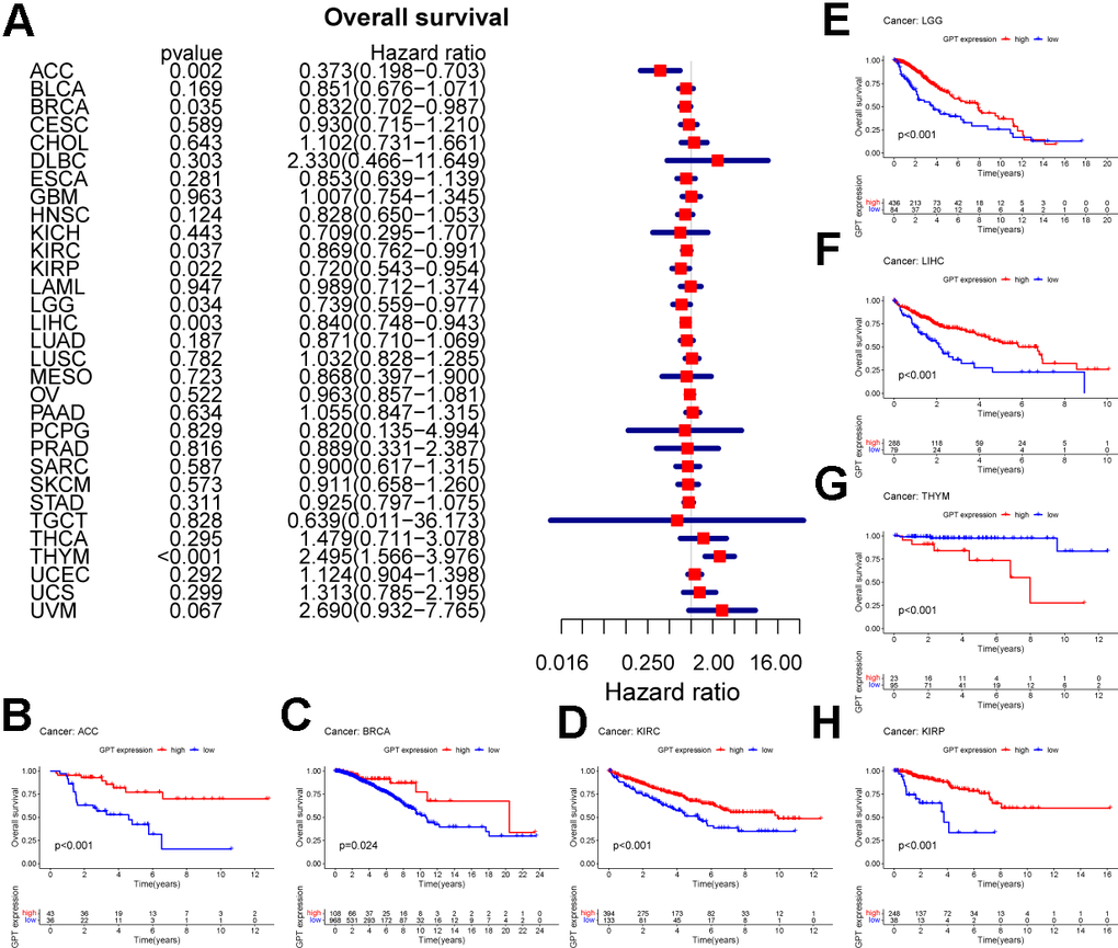 As previously mentioned, we explored the role of GPT expression in the prognosis of pancancer using univariate Cox analysis and drew a forest plot. We found that GPT expression can affect the prognosis of ACC, BRCA, KIRC, KIRP, LGG, LIHC, and THYM. Specifically, GPT acts as a protective factor affecting the prognosis of ACC (HR: 0.373), BRCA (HR: 0.832), KIRC (HR: 0.869), KIRP (HR: 0.720), LGG (HR: 0.739), LIHC (HR: 0.840) and acts as a risk factor affecting the prognosis of THYM (HR: 2.495) (Figure 11A). Finally, for these 7 cancer types, we used the Kaplan-Meier method to analyze the survival curves of different expression levels of GPT, and the results showed that the GPT high expression group had a better prognosis in ACC (Figure 11B), BRCA (Figure 11C), KIRC (Figure 11D), KIRP (Figure 11E), LGG (Figure 11F), LIHC (Figure 11G), and in THYM (Figure 11H) The prognosis is poor.