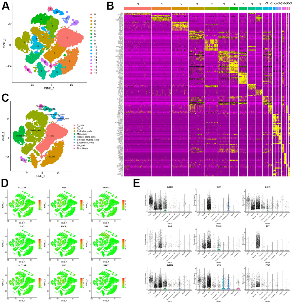 Finally, we explored the distribution of characteristic genes in the TME (Figure 2D). Bubble plots show the expression levels of signature genes in each cell type (Figure 2E). Combining the above results, we found that SLC7A5 was highly expressed in monocyte, B cells and T cells. MET is mainly expressed in endothelial cells and epithelial cells. SHMT2 has similar expression level in other cell types except T cells. CAD and PPAT were expressed at low levels in all cell types. PYCR1 is highly expressed in tissue stem cells, epithelial cells and fibroblasts. GPT is almost exclusively expressed in epithelial cells. SLC3A2 was highly expressed in monocytes, but very low in fibroblasts. MYC is mainly expressed in endothelial cells, smooth muscle cells and epithelial cells.
