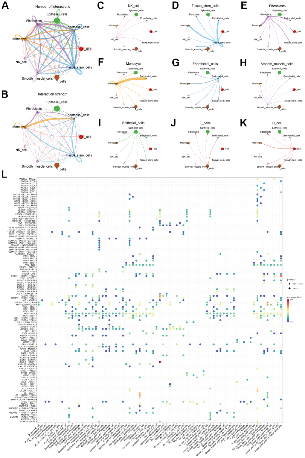 Second, we explored the connections between cells using cell communication analysis. We visualized the number (Figure 3A) and weight (Figure 3B) of interactions between the 9 cell types. And centering on each cell type, the communication relationship between it and 9 cell types is shown separately (Figure 3C–3K). Furthermore, we use heatmaps to visualize the ligand-receptor molecules that mediate interactions between cells (Figure 3L).