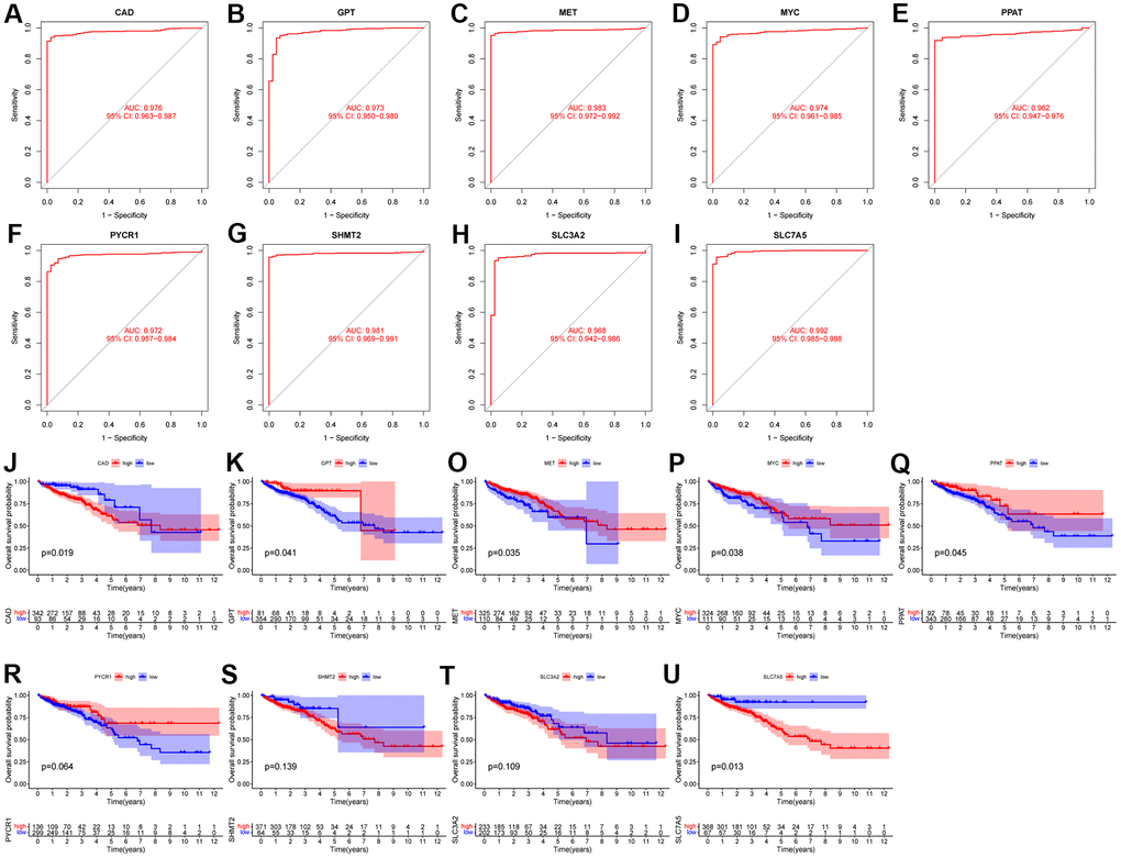 At the same time, we analyzed the survival curves of the 9 characteristic genes with different expression levels using the Kaplan-Meier method (Figure 2J–2U). We found that high expression of CAD and SLC7A5 had a worse prognosis, while high expression of GPT, MET, MYC, and PPAT had a better prognosis. The results showed that high expression of CAD and SLC7A5 had worse prognosis, while high expression of GPT, MET, MYC and PPAT had better prognosis. However, the prognosis of patients with different expression levels of PYCR, SHMT2, and SLC3A2 was not significantly different.