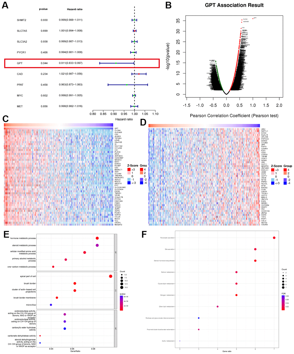 In order to fully understand the biological function of GPT in CRC, we analyzed the co-expression network of GPT in the LinkedOmics database online. The results showed that GPT expression was positively correlated with 3462 genes and negatively correlated with 5207 genes (Figure 5B). The heatmap shows the top 50 most significantly positively and negatively correlated genes with GPT expression, respectively (Figure 5C, 5D). We further performed GO analysis and KEGG analysis on the top 200 significantly positively correlated genes. The bubble charts show the top 15 GO analysis terms (including 5 BP, CC and MF terms respectively) and the 10 KEGG analysis terms (Figure 5E, 5F). GO analysis results showed that, in terms of BP, mainly enriched in hormone metabolic process; one−carbon metabolic process; cellular modified amino acid metabolic process; primary alcohol metabolic process; steroid metabolic process. in terms of CC, mainly enriched in brush border; brush border membrane; cluster of actin−based cell projections; apical part of cell; microvillus. in terms of MF, mainly enriched in carbonate dehydratase activity; oxidoreductase activity, acting on the CH−OH group of donors, NAD or NADP as acceptor; oxidoreductase activity, acting on CH−OH group of donors; steroid dehydrogenase activity, acting on the CH−OH group of donors, NAD or NADP as acceptor; carboxylic ester hydrolase activity. KEGG analysis mainly enriched in Pancreatic secretion; Bile secretion; Steroid hormone biosynthesis; Retinol metabolism; Glycerolipid metabolism. In short, the results suggest that GPT co-expressed genes are mainly involved in various metabolic pathways.