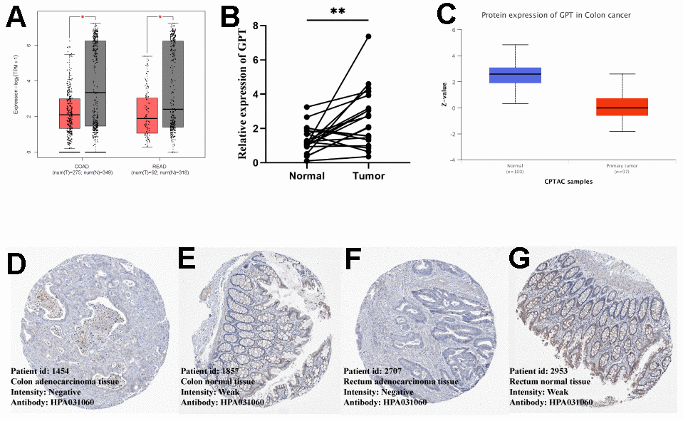 The qRT-PCR experiment was performed according to the previous procedure [30]. Briefly, total RNA from normal and CRC tissues was extracted using RNA-easy isolation reagent (Vazyme, China), and then the RNA was reversed to cDNA using PrimeScript™ RT Master Mix (Takara Bio, Japan). Finally, we performed qRT-PCR reactions using SYBR-Green qPCR Master Mix (Vazyme, China) and normalised using GAPDH. The experimental results were quantified relative to the 2-ΔΔCt method. Primer sequences were designed in this study as follows, The GAPDH primer sequences, forward: GTCTCCTCTGACTTCAACAGCG, reverse: ACCACCCTGTTGCTGTAGCCA. The GPT primer sequences, forward: CAAGAAGGTGCTCATGGAGATGG, reverse: TGTTCACCACCTCCACATAGCC.