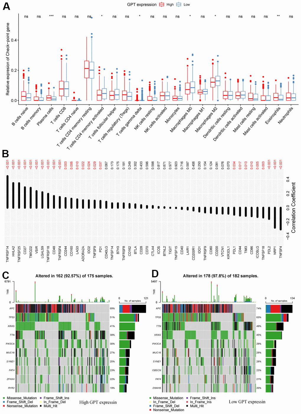 Furthermore, we explored the somatic mutation profile in patients with CRC and identified the 10 most mutated genes in different GPT expression level groups. The results showed that APC, TP53, KRAS, TTN, PIK3CA, MUC16, and SYNE1 were the 8 most mutated genes in different groups of expression level groups, and APC had the highest mutation rate (Figure 7C, 7D).