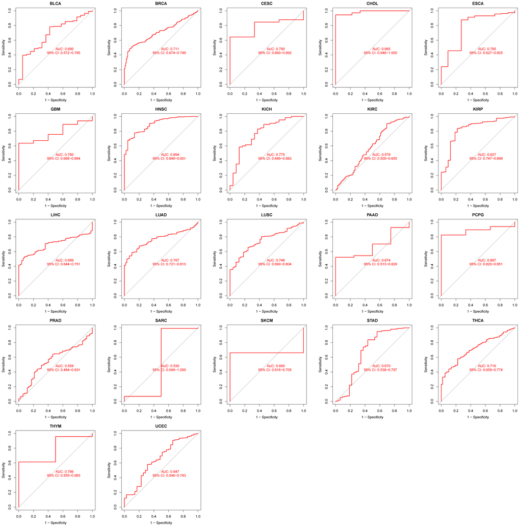As mentioned above, the diagnostic performance of GPT in pancancer is evaluated by the ROC curve. We found that GPT had excellent diagnostic performance in CHOL (AUC: 0.985). In BRCA (AUC: 0.711), CESC (AUC: 0.790), ESCA (AUC: 0.785), GBM (AUC: 0.780), HNSC (AUC: 0.894), KICH (AUC: 0.775), KIRP (AUC: 0.827), LUAD (AUC: 0.767), LUSC (AUC: 0.748), PCPG (AUC: 0.887), THCA (AUC: 0.716) and THYM (AUC: 0.786) had higher diagnostic performance (Figure 9).