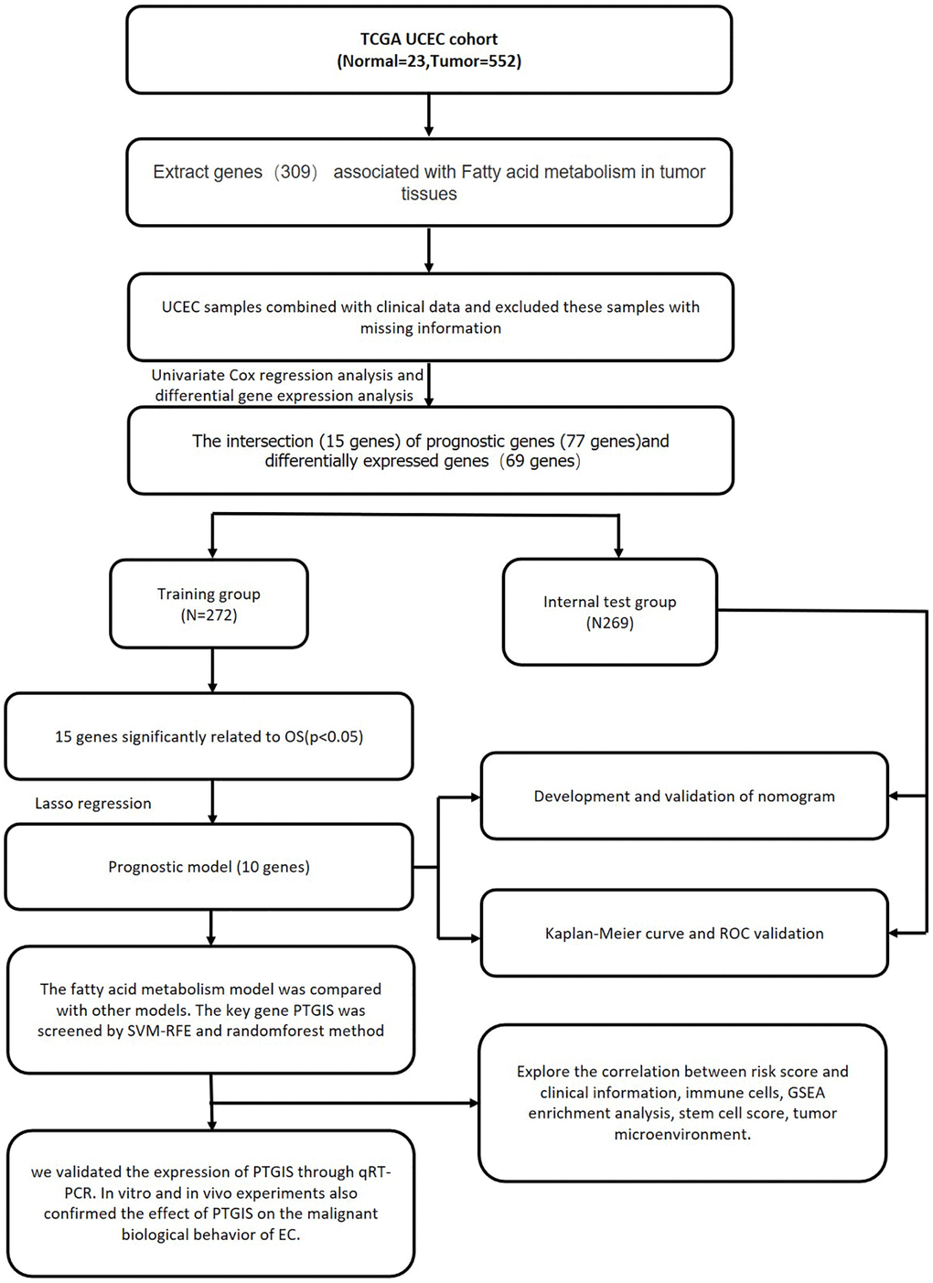 This study does have certain limitations that need to be acknowledged. There was no external validation due to the lack of other datasets with UCEC clinical data. The applicability and effectiveness of the prognostic model in clinical practice require further validation, and future studies are planned to address these aspects. Nonetheless, this study represents the first successful construction of an EC prognostic model utilizing genes associated with fatty acid metabolism, allowing for accurate prediction of EC patient prognosis. Furthermore, we have identified PTGIS as a key gene within the model, highlighting its potential as a diagnostic, predictive, and therapeutic target for EC patients.
