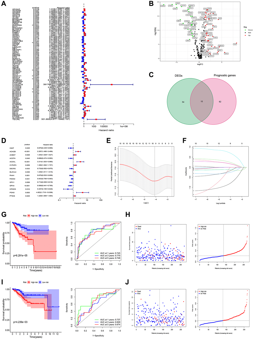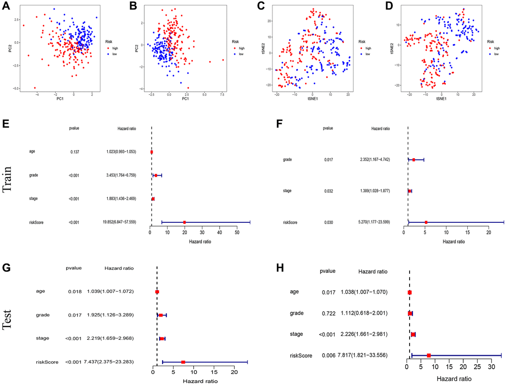 In the univariate Cox regression analysis, it was observed that 77 out of 309 fatty acid metabolism-related genes (FAMGs) exhibited associations with overall survival (OS) (Figure 2A). Vol map was used to identify 69 differentially expressed FAMGs (DEFAMGs) (Figure 2B). The intersection of DEFAMGs and Prognostic associated FAMGs resulted in 15 common genes, as depicted in Figure 2C, 2D. To further refine the selection, Lasso-Cox regression analysis was employed, leading to the identification of these 15 common genes (Figure 2E, 2F). Risk score = e((−0.189 × Exp (INMT)) + (0.188 × Exp (ACACB)) + (−0.260 × Exp (ACOT4)) + (0.722 × Exp (ACOXL)) + (0.175 × Exp (CYP4F3)) + (−0.124 × Exp (FAAH)) + (−0.101 × Exp (GPX1)) + (−0.818 × Exp (HPGDS)) + (−0.054 × Exp (PON3)) + (0.260 × Exp (PTGIS))). Kaplan-Meier (KM) analysis demonstrated that patients with high-risk scores exhibited significantly worse outcomes in the training group (Figure 2G). The area under the receiver operating characteristic (ROC) curves (AUCs) for 1-, 3-, and 5-year OS was calculated as 0.745, 0.770, and 0.748, respectively, in the training group (Figure 2G). Figure 2H depicted the distribution of risk scores and survival status among patients in the training group. We did the same analysis in the test group. The same analysis was conducted in the test group, where the risk score also demonstrated robust predictive ability (Figure 2I, 2J). Furthermore, Principal Component Analysis (PCA) and t-SNE analysis revealed that the model effectively differentiated between high and low-risk groups in both the training set (Figure 3A, 3B) and the test set (Figure 3C, 3D). Subsequent validation through univariate and multivariate analyses consistently corroborated the autonomous independent prognostic significance of the established risk score, substantiated across in both the training set (Figure 3E, 3F) and the test set (Figure 3G, 3H).