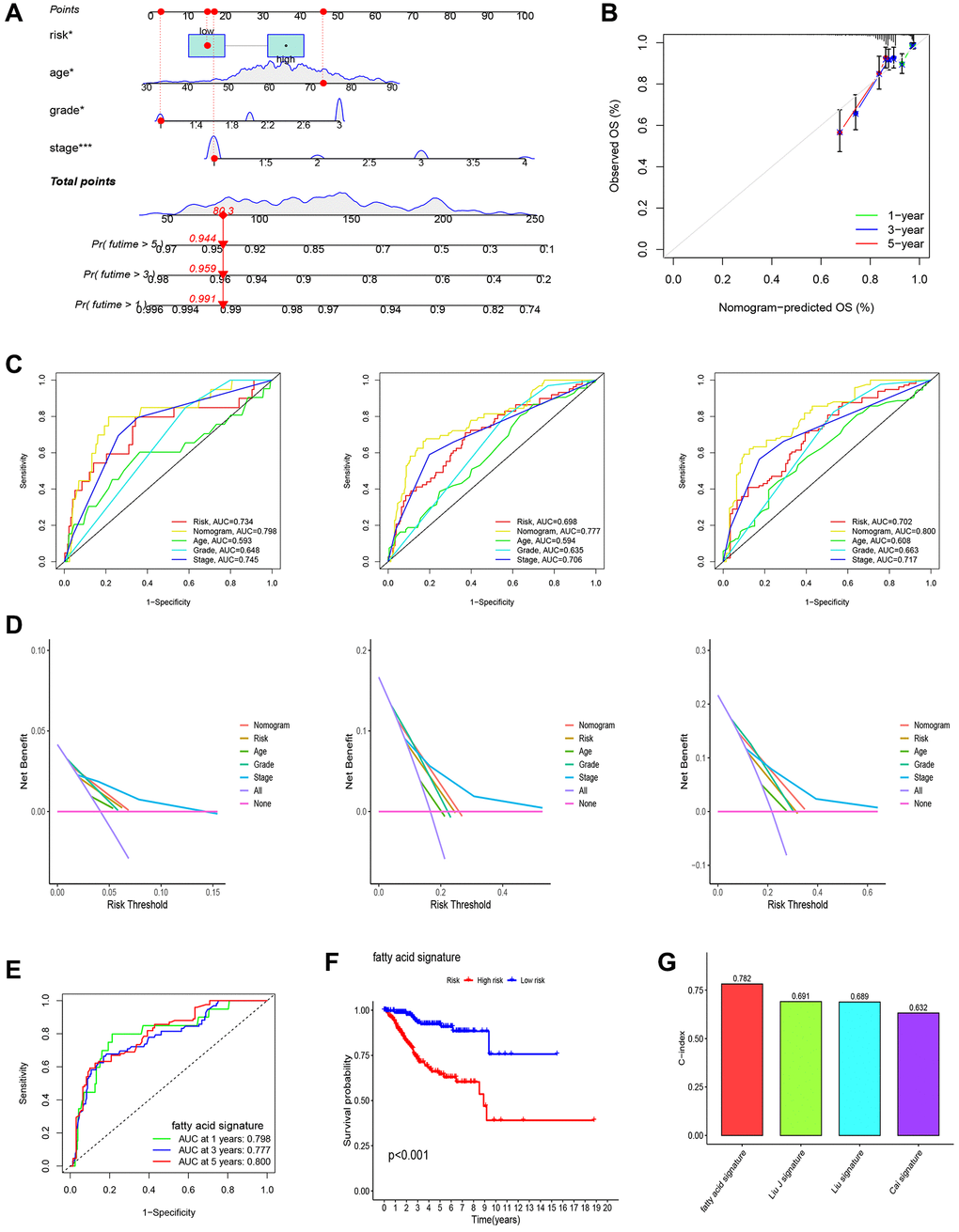 To enhance the predictive capability of our model, we further developed a nomogram, as depicted in Figure 4A. The calibration curves demonstrated the accuracy and validity of the nomogram (Figure 4B). The AUCs for 1-, 3-, and 5-year OS using the nomogram were calculated as 0.798, 0.777, and 0.800, respectively (Figure 4C). Decision curve analysis (DCA) results show that nomogram has good prediction efficiency (Figure 4D). KM analysis and ROC curves also illustrated the improved predictive power of the nomogram (Figure 4E, 4F). Additionally, the C-index results indicated that our constructed model outperformed the three other models developed by Cai, Liu, and Liu J [12–14] (Figure 4G).