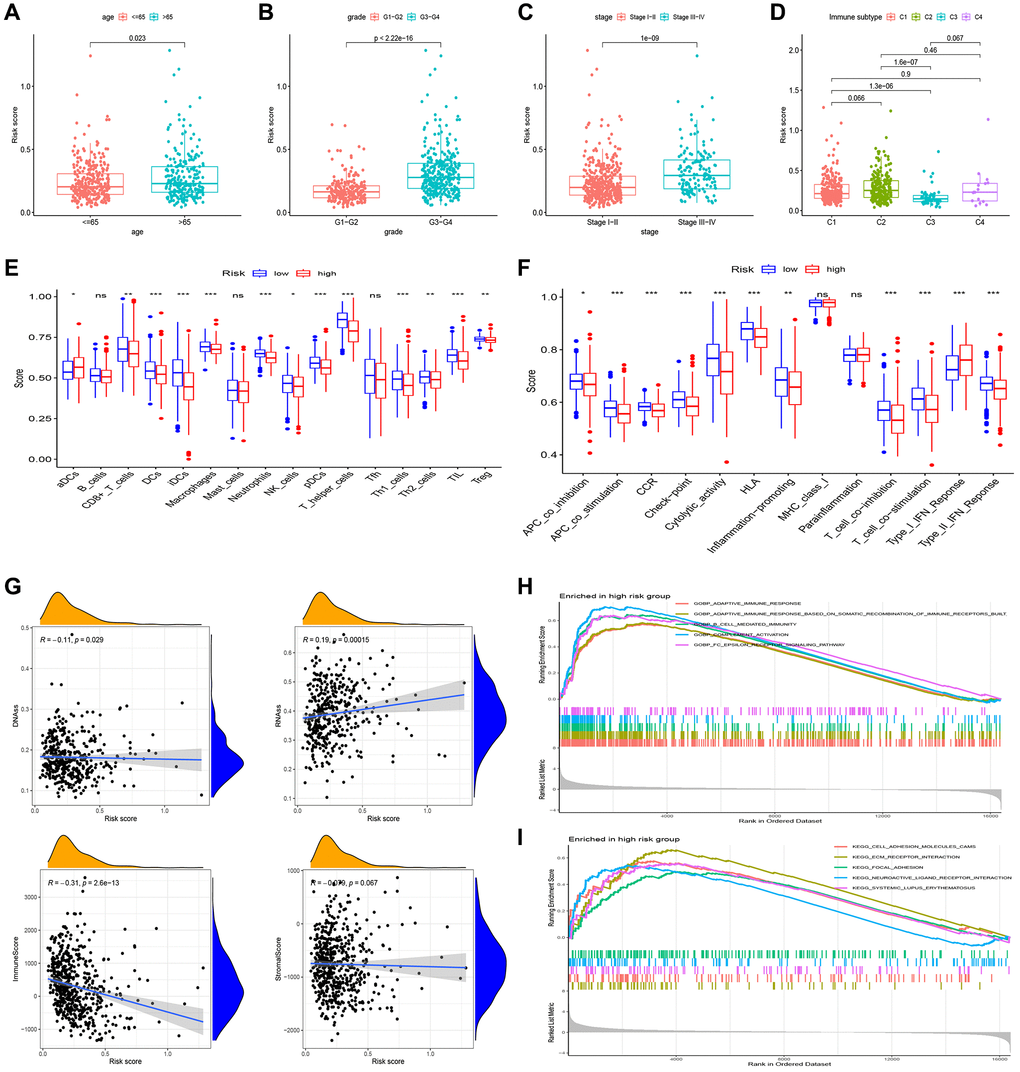 In our study, we performed pathway enrichment analysis specifically for the high-risk group. The GSEA enrichment analyses revealed significant enrichments in various pathways. In the high-risk group, pathways such as adaptive immune response, mediated immunity, complement activation, B cell-mediated immunity, cell adhesion molecules, ECM receptor interaction, focal adhesion, neuroactive ligand-receptor interaction, and systemic lupus erythematosus exhibited significant enrichments (Figure 5H, 5I).
