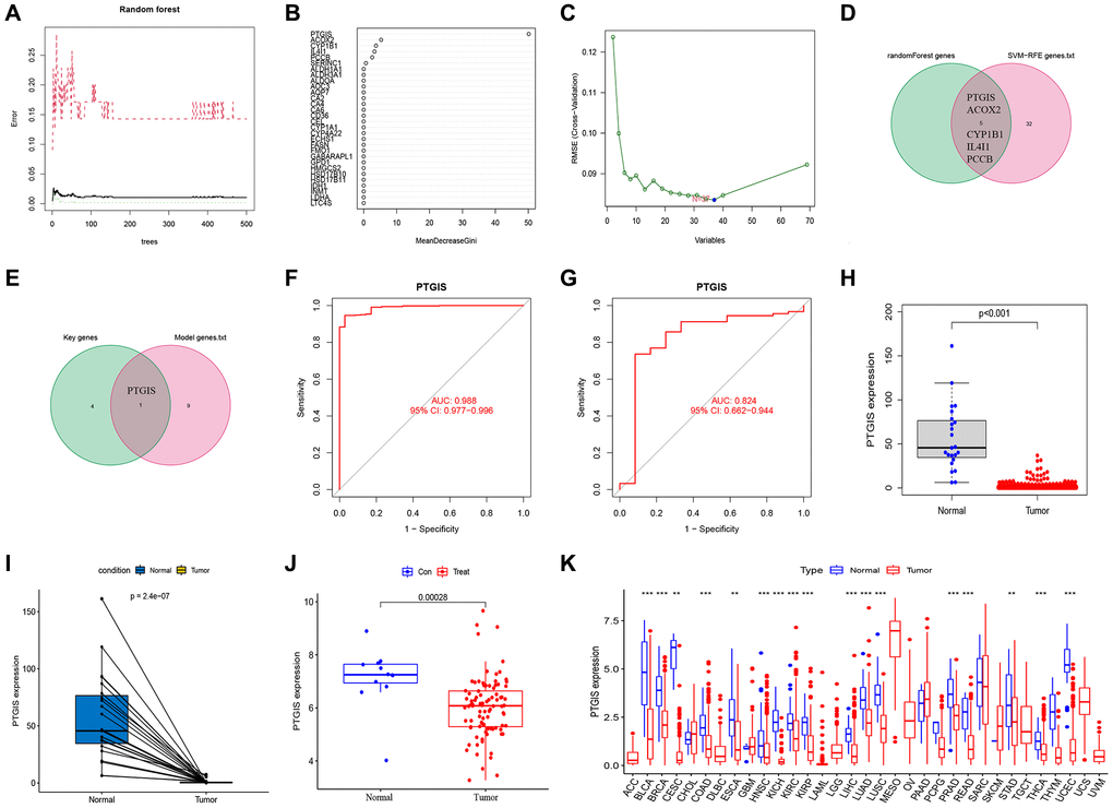 We utilized random forest analysis to screen the 309 FAMGs and identified genes relevant to EC (Figure 6A, 6B). The SVM-RFE algorithm was employed to select the expression of feature genes from the 309 FAMGs (Figure 6C). By intersecting the results of random forest analysis with those of SVM-RFE, we identified 5 key characteristic genes (PTGIS, ACOX2, CYP1B1, IL4I1, PCCB) (Figure 6D). From these 5 key feature genes, we further intersected them with the genes involved in model construction and identified PTGIS as the key gene within the model (Figure 6E). The AUC of PTGIS as a diagnostic gene was determined as 0.988 in the TCGA-UCEC database (Figure 6F). To validate the diagnostic capability of PTGIS for EC, we obtained the external dataset GSE17025 and found that the AUC of PTGIS was 0.824 in this dataset (Figure 6G). Additionally, we observed down-regulated expression of PTGIS in both the TCGA-UCEC dataset (Figure 6H, 6I), and the GSE17025 dataset, further confirming its association with EC (Figure 6J). Furthermore, in pan-cancer analysis, it was consistently observed that PTGIS was down-regulated in most tumors (Figure 6K).