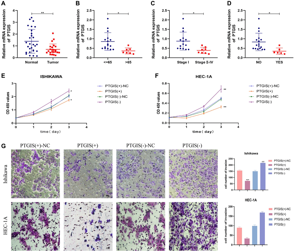 The qRT-PCR results demonstrated down-regulation of PTGIS expression in EC (Figure 7A). Additionally, we conducted an analysis to examine the relationship between PTGIS expression and clinicopathological parameters. The findings indicated that PTGIS expression was decreased in the >65 age group, tumor stage III–IV group, and lymph node (LN) metastasis group (Figure 7B–7D).