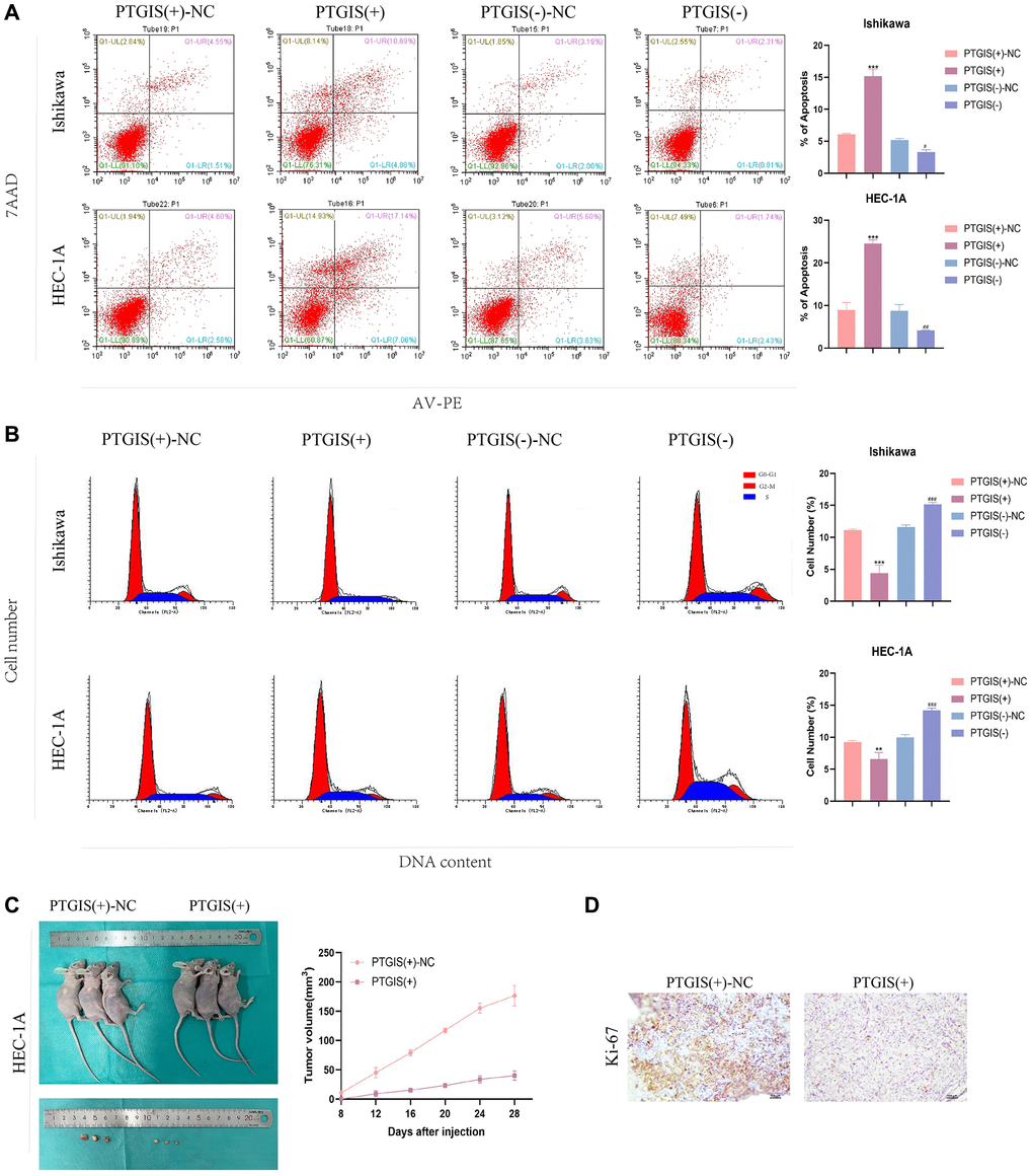 To evaluate the impact of PTGIS on cellular functions, we performed the CCK-8 assay to assess cell proliferation. The results demonstrated that overexpression of PTGIS inhibited cell proliferation, whereas reducing PTGIS expression enhanced cell proliferation in ISHIKAWA and HEC-1A cells (Figure 7E, 7F). Furthermore, overexpression of PTGIS decreased cell invasion ability, while decreased PTGIS expression promoted cell invasion (Figure 7G). Apoptosis experiments revealed that overexpression of PTGIS promoted apoptosis, whereas knockdown of PTGIS inhibited apoptosis (Figure 8A). Cell cycle analysis demonstrated that compared to the PTGIS (+)-NC group, the PTGIS (+) group exhibited a decrease in the number of cells in the G2-M phase of the cell cycle. Conversely, compared to the PTGIS (−)-NC group, the PTGIS (−)-NC group displayed an increased proportion of cells in the G2-M phase in both ISHIKAWA and HEC-1A cells (Figure 8B). The outcomes of the tumor formation experiment conducted in nude mice distinctly demonstrated that the overexpression of PTGIS yielded a notable suppression in tumor growth, as evidenced by a significant contrast between the PTGIS (+) group and the PTGIS (+)-NC group (Figure 8C). Immunohistochemical results showed that the KI-67 staining score of PTGIS (+) group was lower than that of PTGIS (+)-NC, further indicating that overexpression of PTGIS inhibited the growth of EC (Figure 8D).