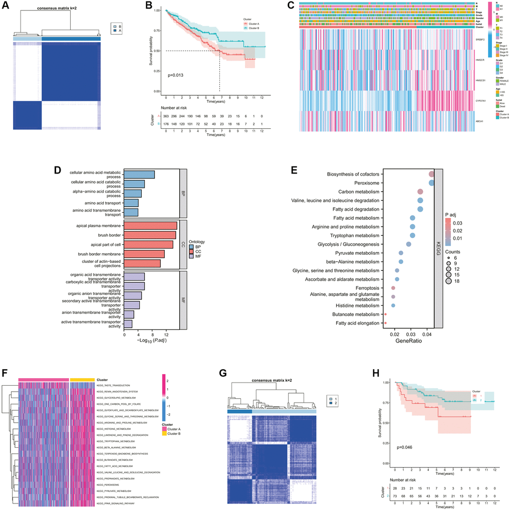 The whole research design was illustrated in Supplementary Figure 1. Initially, we examined the associations between these CMGs and the outcome of ccRCC patients. The prognosis of ccRCC patients showed a significant correlation with the expression levels of 9 CMGs, as revealed by our analysis. Patients with elevated expression levels of SCARB1, HMGCS1, HMGCR, SREBF2, CYP27A1, and ABCA1 demonstrated improved overall survival (OS) (Figure 1A–1F). Conversely, patients displaying heightened expression of LDLR, CYP7A1, and SOAT1 exhibited poorer overall survival OS (Figure 1G–1J). Univariate Cox regression analysis was performed for these 9 genes, and finally 5 CMGs with stronger prognostic value were obtained. We conducted cluster analysis to examine the potential synergistic impact of these five survival-related CMGs on ccRCC. Accordingly, ccRCC patients from the TCGA cohort were sorted into clusters A (n = 467), and B (n = 72) under the clustering coefficient k = 2 (Figure 2A). At this point, the clusters were evidently differentiated from one another, exhibiting a strong internal cluster coherence. Further survival analysis indicated that patients belonging to cluster A experienced a more unfavorable prognosis (p < 0.05; Figure 2B). A heatmap depicted the expression patterns of the 5 CMGs and the corresponding clinical characteristics within each cluster (Figure 2C). To further investigate the heterogeneity of each lactate cluster, we identified 924 DEGs and then conducted functional enrichment analysis for these DEGs. In terms of biological processes (BPs) of GO analysis, the DEGs were principally involved in cellular amino acid metabolic and catabolic processes. In terms of cellular components (CCs), the DEGs were mainly enriched in the apical plasma membrane and brush border. In terms of molecular functions (MFs), the DEGs were significantly enriched in the organic acid and carboxylic acid transmembrane transporter activity (Figure 2D). At the same time, the KEGG pathway analysis showed the DEGs were enriched in biosynthesis of cofactors, peroxisome, and carbon metabolism (Figure 2E). GSVA analysis showed that cluster B was markedly enriched in pathways associated with activation of the nutrient metabolism, including glycerolipid metabolism, β-alanine metabolism, fatty acid, and propanoate metabolism (Figure 2F). To confirm the reliability of molecular classification, the E-MTAB-1980 cohort underwent the identical classification pipeline, and the KM analysis yielded consistent outcomes as the TCGA cohort (Figure 2G, 2H).