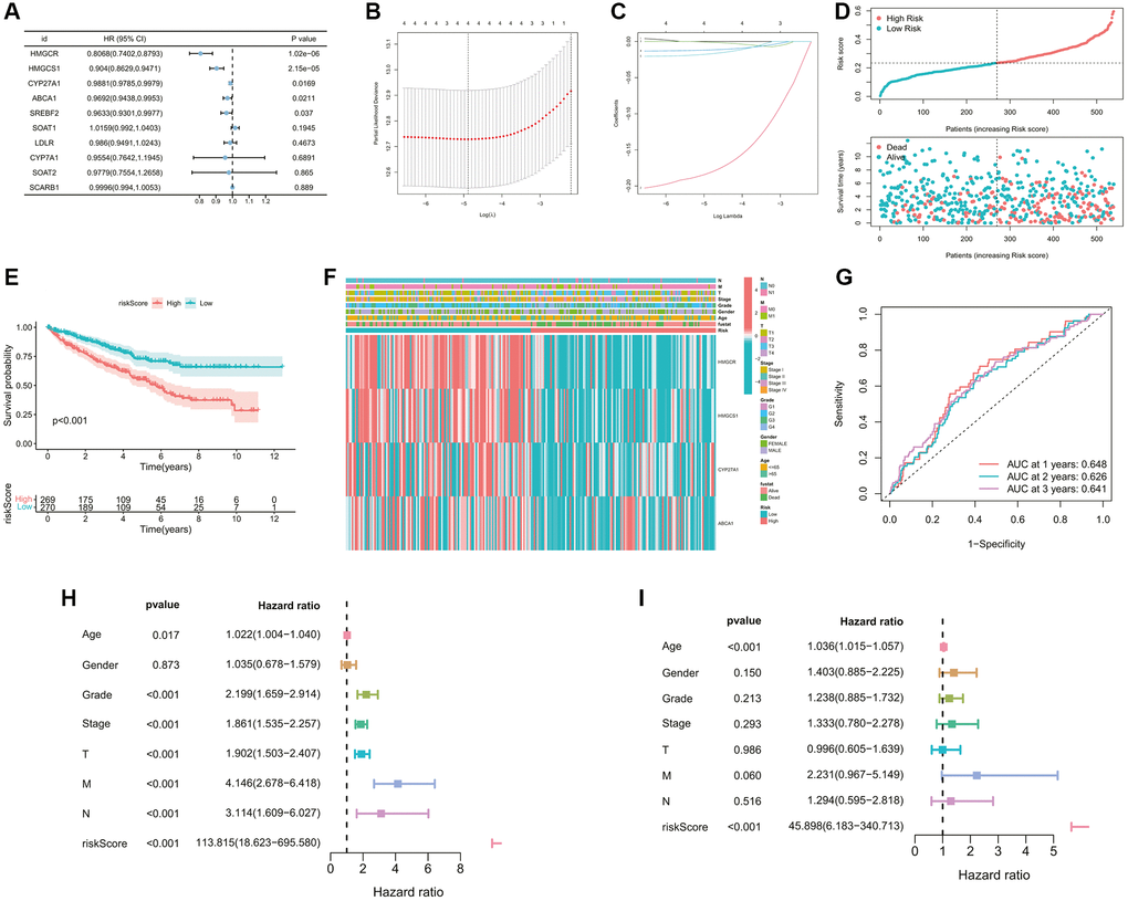The risk score was then calculated for each case. Its mean threshold divided the ccRCC patients into two subgroups (low-risk (n = 270) and high-risk (n = 269)). Riskscore showed a negative correlation with patient survival based on the distribution of Riskscore in ccRCC samples (Figure 4D). KM analysis confirmed a lower likelihood of survival in the high-risk group (p < 0.05, Figure 4E). The heatmap visualized the differences in gene expression profile and clinical characteristics between the two risk subgroups (Figure 4F). An evaluation of the predictive performance was conducted with the time-dependent ROC curve of the model. The AUCs reached 0.648 in 1 year, 0.626 in 2 years, and 0.641 in 3 years (Figure 4G), which confirmed the stability of the predictive efficiency of our model. Univariate and multivariate Cox analyses were also performed to further explore the independent predictive ability of our signature. In the univariate Cox regression analysis, age, grade, overall stage, pathological T, N, M stage, and risk score were associated with the OS rates of ccRCC patients (all p < 0.05, Figure 4H). Furthermore, multivariate Cox analysis revealed that only age as well as the risk score of our signature (hazard ratio, 74.126; CI, 11.505 to 477.592; p-value < 0.001) remained an independent prognostic factor for ccRCC (Figure 4I).