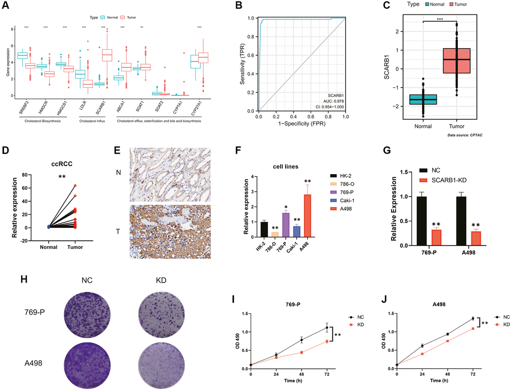 Figure 6B demonstrated a high diagnostic specificity with an AUC of 0.9597 for SCARB1 in ccRCC cases. The protein expression data from the CPTAC database further validated that SCARB1 exhibited significantly elevated expression at the translational level in ccRCC tissues, in comparison to the adjacent normal tissues (Figure 6C). Subsequently, RT-qPCR and IHC were performed. The results demonstrated that, compared with the adjacent normal tissues, the mRNA expression level of SCARB1 was significantly increased in ccRCC tissues (p < 0.01, Figure 6D). Through IHC, the protein expression of SCARB1 was detected on tumor cells, which was consistent with previous bioinformatics data (Figure 6E). Thus, we considered that SCARB1 may be a potential diagnostic biomarker for ccRCC and could be a promising therapeutic target.