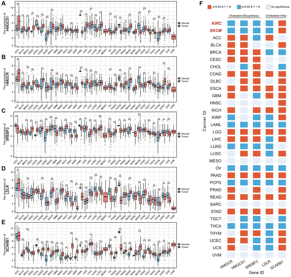 The exogenous cholesterol-dependent characteristic of ccRCC aroused our interest, and we wondered whether this phenomenon was unique among common malignant tumors. Based on the data of the TCGA database, we analyzed the difference in expression levels of genes related to cholesterol sources in 33 common malignant tumors, including 3 genes mediating cholesterol biosynthesis and 2 genes mediating cholesterol intake (Figure 7A–7E). Figure 7F summarized the results of differential analysis of 5 genes. We found that besides ccRCC (KIRC for cancer id), skin cutaneous melanoma (SKCM) also exhibited the SCARB1-mediated exogenous cholesterol dependent characteristics.