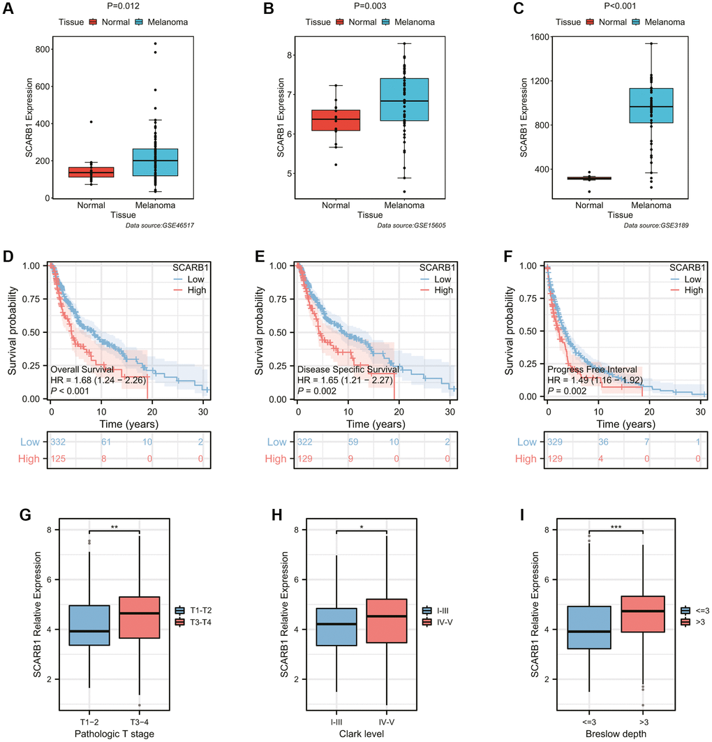 Firstly, three SKCM cohorts from the GEO database were employed to verify the difference of SCARB1 expression between SKCM and normal skin tissues. In all cohorts, the expression of SCARB1 in SKCM was significantly higher than that in adjacent normal tissues (all p < 0.05, Figure 8A–8C). Then, the survival differences between SKCM patients in high- and low-SCARB1 expression groups were investigated with different survival indicators used as observation outcomes. SKCM patients with high SCARB1 expression possessed worse OS, disease specific survival (DSS), and progress free interval (PFI) in Figure 8D–8F (all p < 0.05). The differences in SCARB1 expression among SKCM patients stratified based on different classic prognostic factors were also explored. SKCM patients with advanced tumor state (pathologic T stage 3–4, Clark level IV-V, and Breslow depth >3 mm) tended to express more abundant SCARB1 significantly (all p < 0.05, Figure 8G–8I). The above results indicated that, consistent with ccRCC, the expression of SCARB1 was also an important prognostic factor in SKCM, playing a promoting role in the occurrence and development of SKCM.