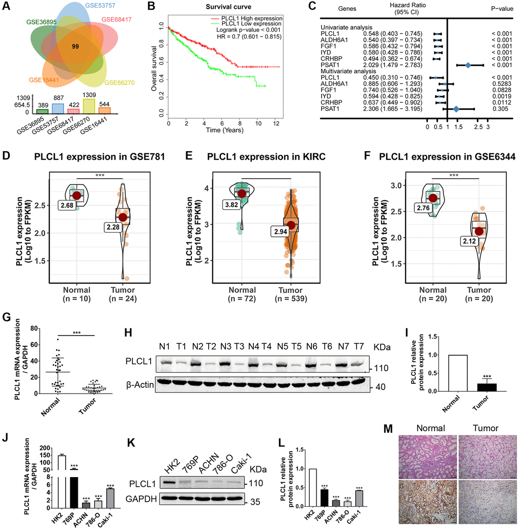 Phospholipase C-like protein 1 (PLCL1), a member of the phospholipase C family, is expressed in a range of organs, including the brain, heart, and kidney, and unlike phosphatidylinositol 4,5-bisphosphate (PIP2) and phosphatidylinositol (PI), exhibits catalytic activity [5]. A previous study indicated that PLCL1 mutation could deactivate the 1,4,5-trisphosphate (IP3)-mediated calcium pathway, a crucial signal in regulating mechanical sensing of bone cells, altering the hip bone size in females [6]. Moreover, a cohort investigation revealed that an underlying genetic susceptibility due to PLCL1 was correlated with idiopathic inflammatory myopathies in different ethnic populations of Chinese Han [7]. Recently, it has been demonstrated that PLCL1 induces abnormal lipid metabolism in tumour cells by interacting with metabolism-related gene uncoupling protein 1 (UCP1), repressing RCC progression [8]. These studies all support the contention that PLCL1 is as an important regulator in disease.
