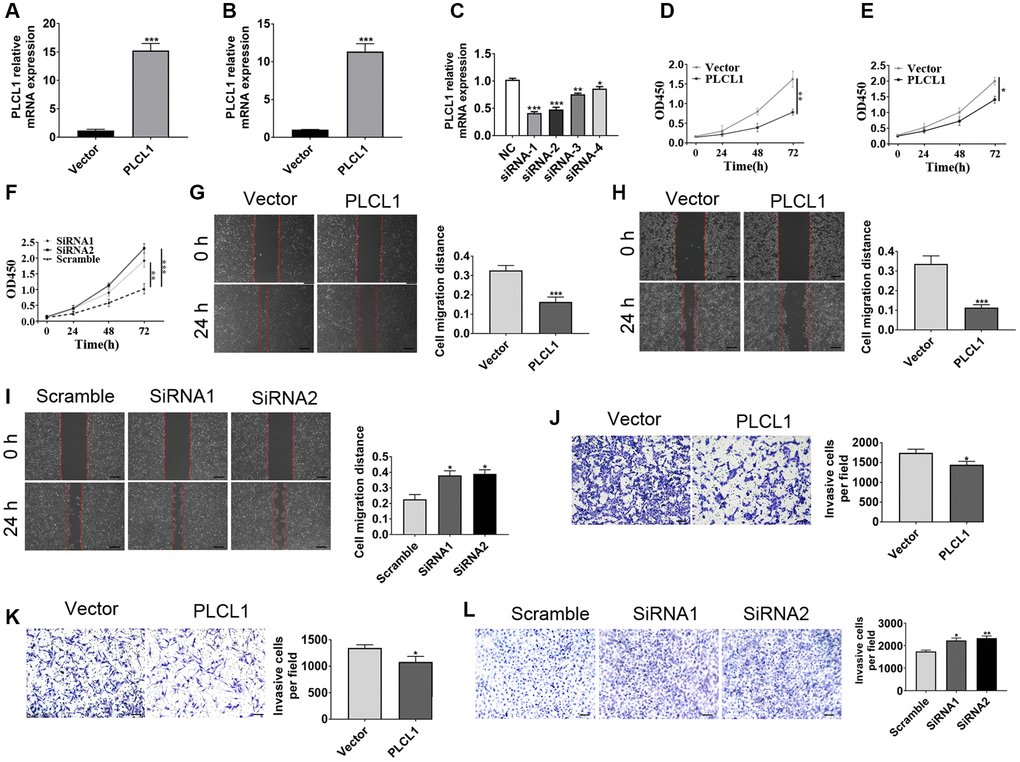 To assess the function of PLCL1 in the progression of RCC, the ACHN, 786-O and 769P cell lines were utilized for functional experiments. ACHN and 786-O cells were transfected with lentivirus overexpressing PLCL1, whereas 769P was transfected with siRNA against PLCL1. Both the PLCL1 transfection efficiency in overexpression and knockdown cell were verified by RT–qPCR (Figure 2A–2C). The results of cell proliferation assays using CCK8 showed that PLCL1 overexpression significantly repressed the proliferation of ACHN and 786-O cells, while knockdown of PLCL1 reversed this alteration in 769P cells (Figure 2D–2F). The results of wound healing assays indicated that elevated levels of PLCL1 decreased the migratory distance of 786-O and ACHN cells (Figure 2G, 2H), but PLCL1 knockdown induced migratory capacity in the 769P cell line (Figure 2I–2L). Similar results were observed in the transwell assay. Together, these results suggest that PLCL1 represses tumour proliferation and invasion in RCC cells.